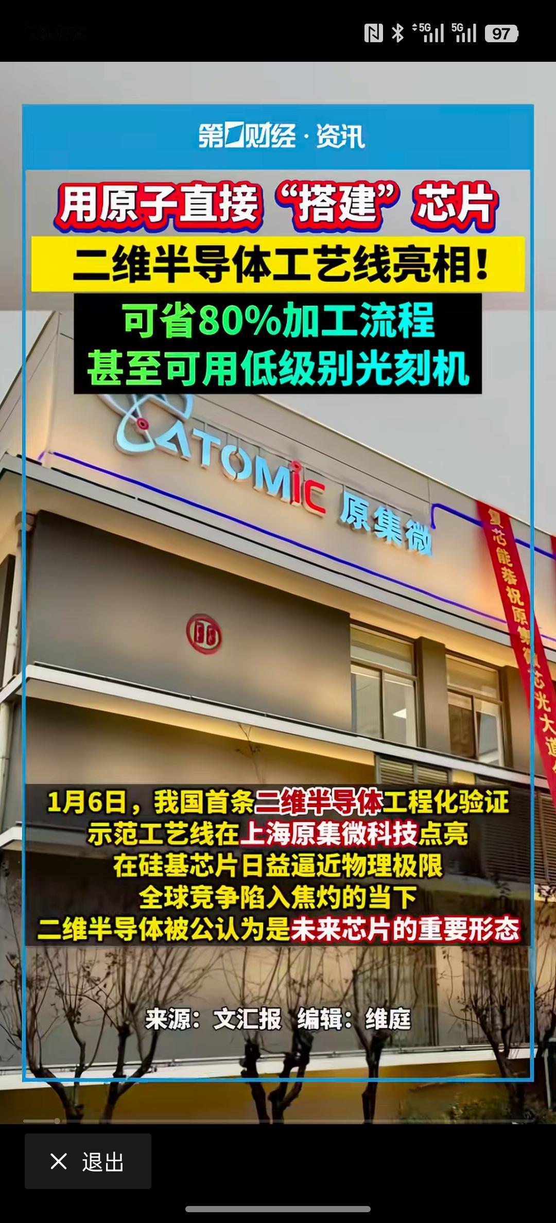中国的芯片发展又有了新的路径,用原子直接搭建芯片!二维半导体的工艺将会亮相!根据这样的技术发展,可以省80%的工作流程,甚至可以用低级的光刻机来实现芯片的制造!这也是被广泛认为,未来芯片最重要的发展路径,芯片重要的形态,因为芯片它是由物理定律的!就是一纳米的芯片!芯片可能有多种路径发展,比如光子芯片,量子芯片!是未来可以突破物理芯片的极限!