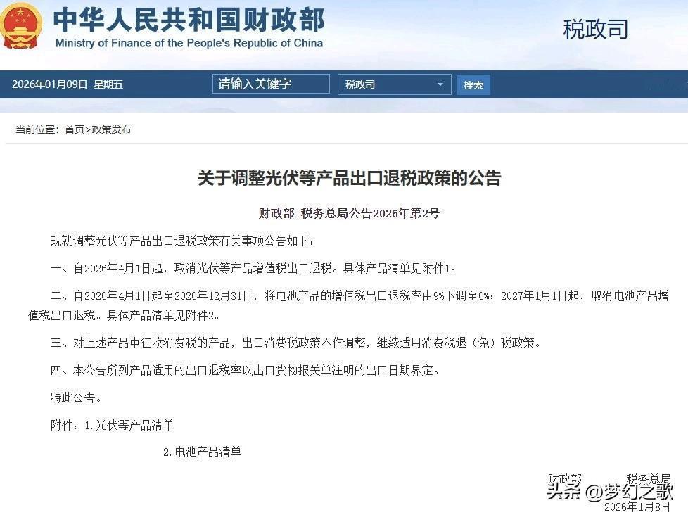A股刚刚收盘,光伏,锂电池板块爆出来了重大利空消息 自4约1起光伏就没有退税的环节了,怎么说呢。就是为了增加国内光伏企业的竞争力,国家一直在对光伏增值税出口退税,现在这部分税没有了。锂电池也是一样,自2017年开始也没有了。 原来的增值税是13%,也就是说这部分钱要企业自己来出了,变相增加了企业的成本。据统计这个消息会让光伏企业出口成本增加4%,利润空间直接被压缩了,以后靠退税生存的小企业会直接退出光伏行业。