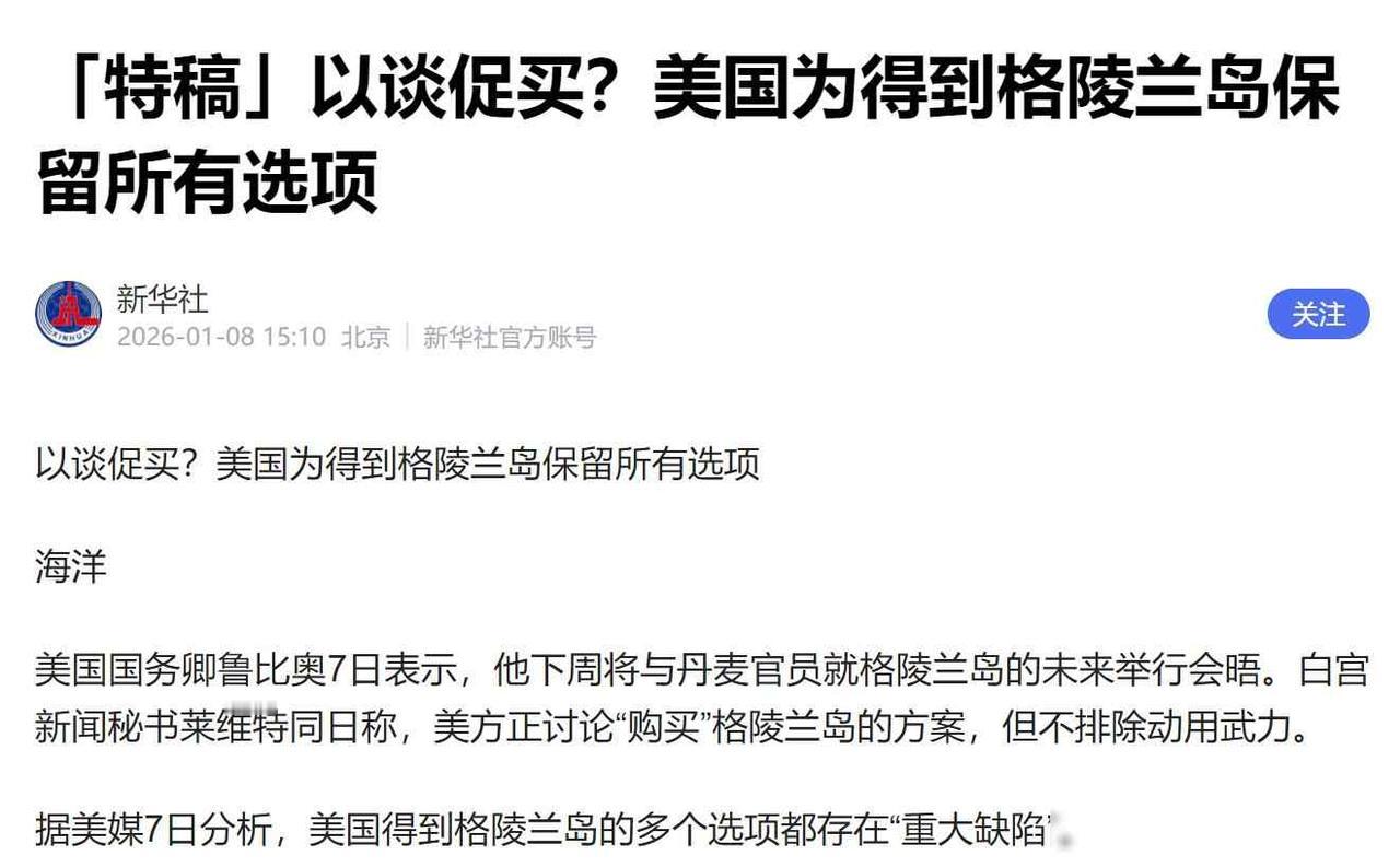特朗普盯上格陵兰,丹麦敢开枪,北约快散架 现在是2026年1月9号,美国那边真要动手了,特朗普政府从年初开始对格陵兰施加压力,一边说要买下这个岛,一边暗中支持当地居民争取独立,还保留着动用军队的可能,丹麦这边也没有示弱,在8号那天直接命令军队可以先开枪再请示,这在北约内部很少见,他们不是想挑起战争,而是担心美国真的采取强硬手段。 这件事其实早有迹象,去年年底特朗普用武力手段解决马杜罗问题后,胆子变得更大了,他看上了格陵兰的稀土资源、航道位置和监听站点,认为这块地方很有价值,可是全世界都没把它当成重要事情,连《外交事务》杂志都没提到它,说明这件事根本算不上国际共识,就是特朗普自己突然决定的。 欧盟那边反应很快,二十七个国家头一回联手说要保护丹麦,派军队到冰岛和法罗群岛去布防,不过说实话,他们的家底很薄,欧洲每年军费有六成都交给美国管的北约了,他们自己的常备军队加起来还不到二十万,丹麦自己只有七千五百人,所谓的“欧洲军”还在纸面上,既没有指挥系统,也没有后勤保障,更缺少法律依据,真要打起来的话撑不了几天。 美国方面采取隐秘行动,向格陵兰首府努克投入两千多万美元资金,用以扶持亲美势力推动独立公投,尽管国际法层面无法正式承认新国家,但美国政府沿用历史模式,绕过丹麦政府直接与格陵兰签订协议,这种操作手法与当年对待巴拿马的方式如出一辙,表面遵循法律程序,实质上是在瓦解现有政治格局。 北约内部现在出现很多问题,特朗普早就觉得北约在拖后腿,去年还削减了给东欧的军事援助大约三成,如果美国真的对格陵兰采取行动,第五条关于集体防御的规定是否适用变得不确定,因为这是针对盟友的土地而不是外部敌人,加拿大方面已经感到着急,总理卡尼准备在15号前往中国讨论合作事项,美国和加拿大的关系现在比冷战时期还要冷淡。 俄罗斯这边当然高兴看到这种情况,他们利用北极理事会跟丹麦和冰岛商量科研合作的事,嘴上说“北极不能只由强权决定”,其实心里清楚得很,北大西洋一出乱子,他们的北方航道就热闹起来,北极那边的基地早就进入最高警戒状态,就等着有机会占便宜。 最讽刺的是,欧盟喊得响亮却拿不出什么实际本事,丹麦说狠话也就是吓唬人罢了,美国实力最强可一出手就把整个西方阵营搞得四分五裂,如果真打起来欧洲会更快脱离美国的影响,以后谁说了算还真不一定。