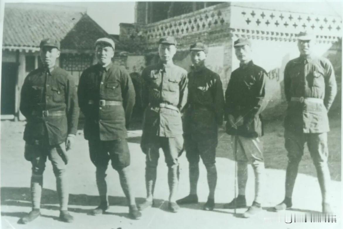 1937年7月,在陕西省泾县云阳镇红军前敌总指挥部召开红军高级干部会议期间合影,左起:左权(红一军团代理军团长)、彭德怀(西方野战军司令员兼政委)、聂荣臻(红一军团政委)、陈赓(红一师师长)、孙毅(红一军团副参谋长)、聂鹤亭(红一军团参谋长)。