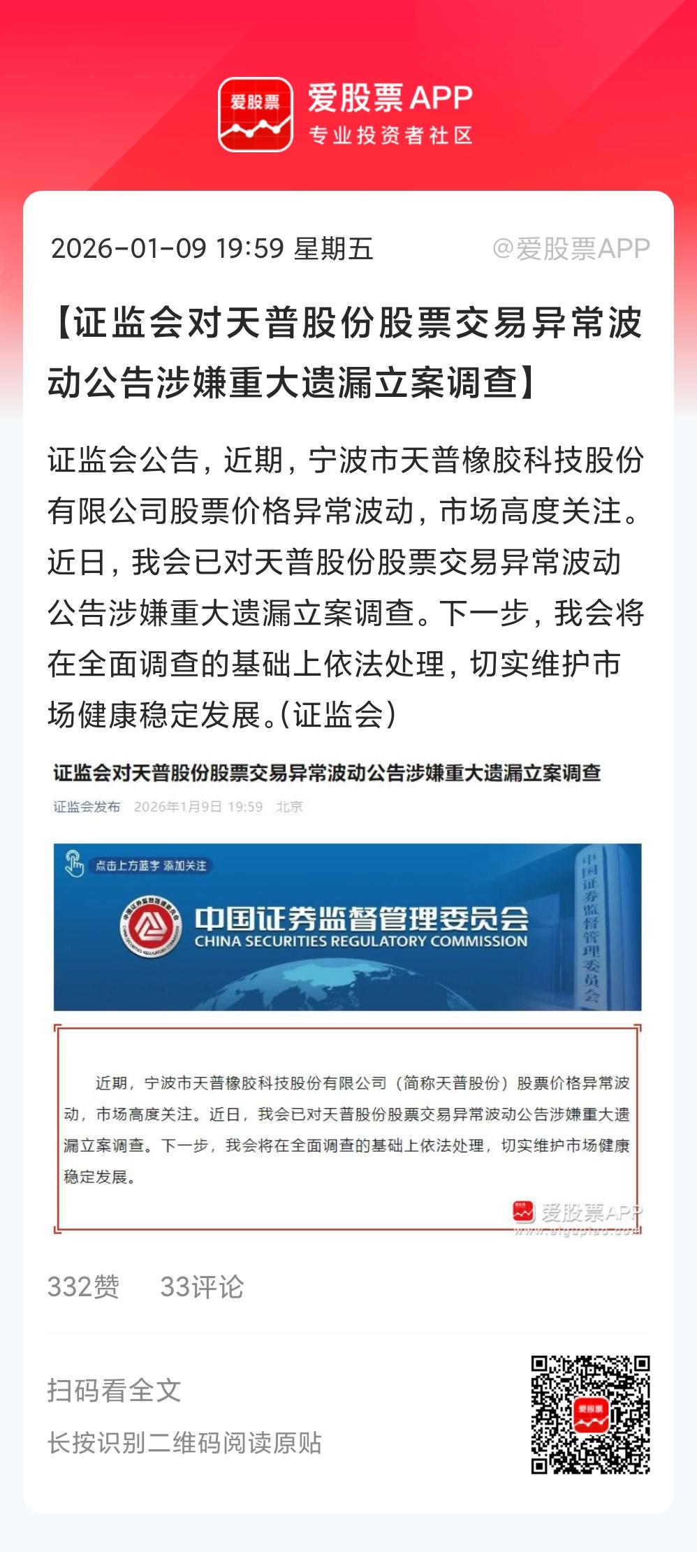 天普股份因为股票交易异常波动,被证监会立案调查,这个原因应该是第一次吧!涉嫌重大遗漏,说明就是有内幕资金知道利好了,然后天天顶一字吃独食,引发村里的震怒。 天普去年涨了近20倍,三次关小黑屋,无数次提示风险;中昊芯英强调无借壳目的,无注入资产计划,但市场一致认为“你有”! 之前上交所下发监管函,现在被立案调查了。这个就很严重了,重组大概率要失败的。天普股份已经停牌了10天,可能下周就要出来了,估计要数一字板跌停了。这对那些高标、重组预期的高位股都算情绪利空了。