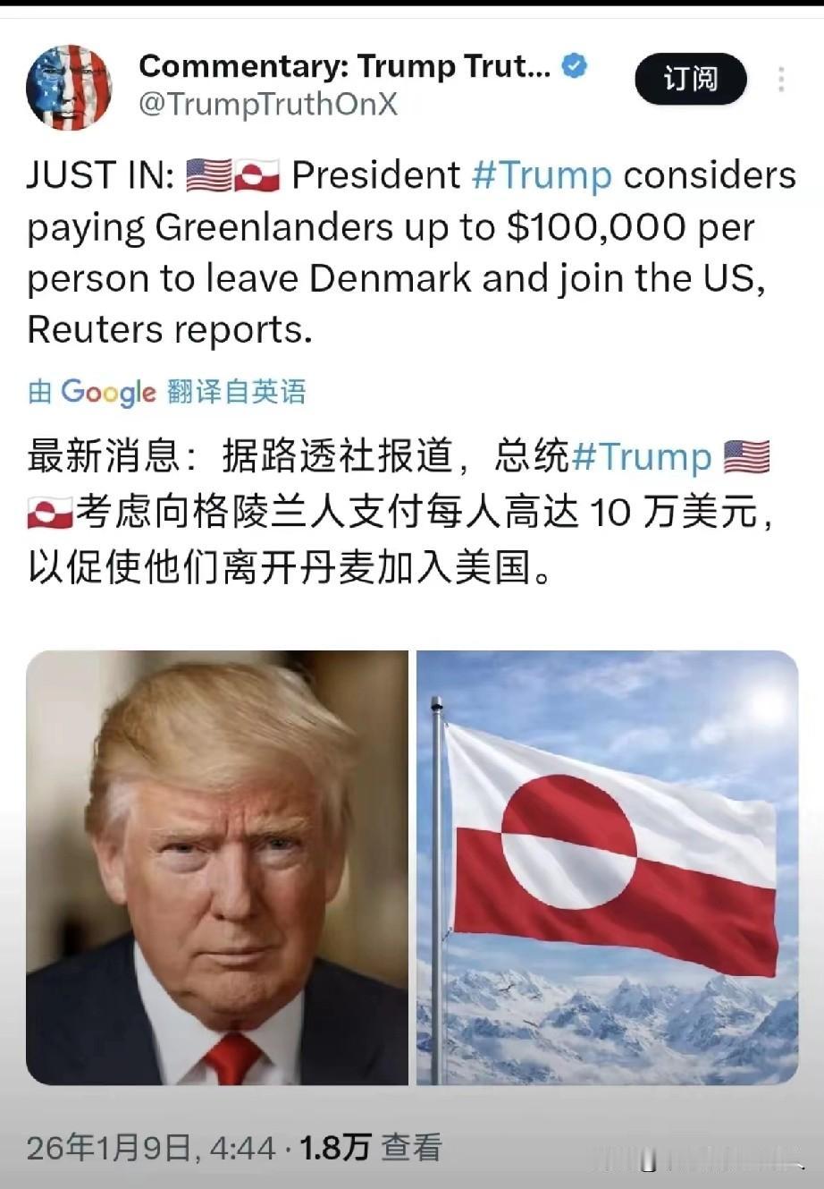 据路透社报道,特朗普考虑向每位格陵兰人支付高达10万美元, 促使他们脱离丹麦,加入美国。 按照格陵兰岛现有的约5.6万居民计算,每人10万美元,美国只需花费60亿美元,就能拿下世界第一大岛。要知道,格陵兰岛总面积约216.6万平方公里,相当于美国现有领土面积的四分之一,这笔买卖相当划算。 倘若真是如此,我建议国内随便派一家公司参与竞拍,毕竟只需几百亿人民币,有这个实力的公司并不少。