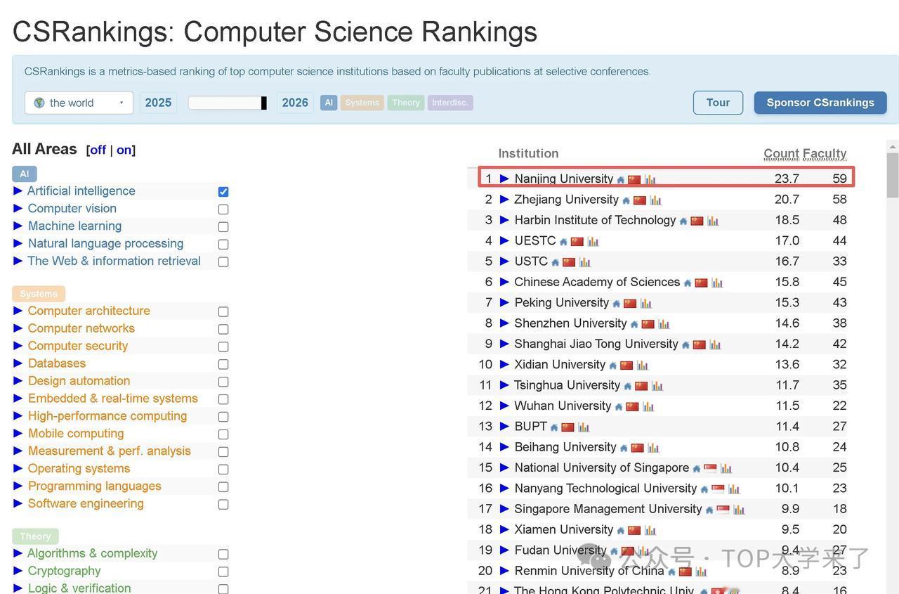 全球第一!南京大学“夺冠”了! 近日,计算机科学权威榜单2026CSRankings正式公布,在人工智能学科全球排名里,南京大学以23.7分的优异成绩拔得头筹,刷新了国内高校在该榜单的最佳成绩。 在其之后,是浙江大学、哈尔滨工业大学、北京大学、中国科学技术大学等一众名校。 南大,这次终于甩掉“守门员”称号了。