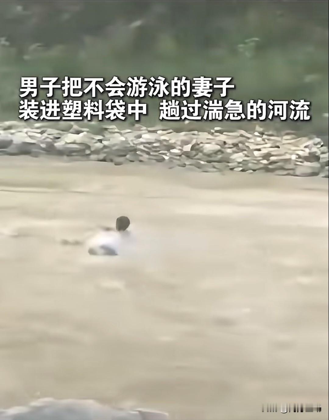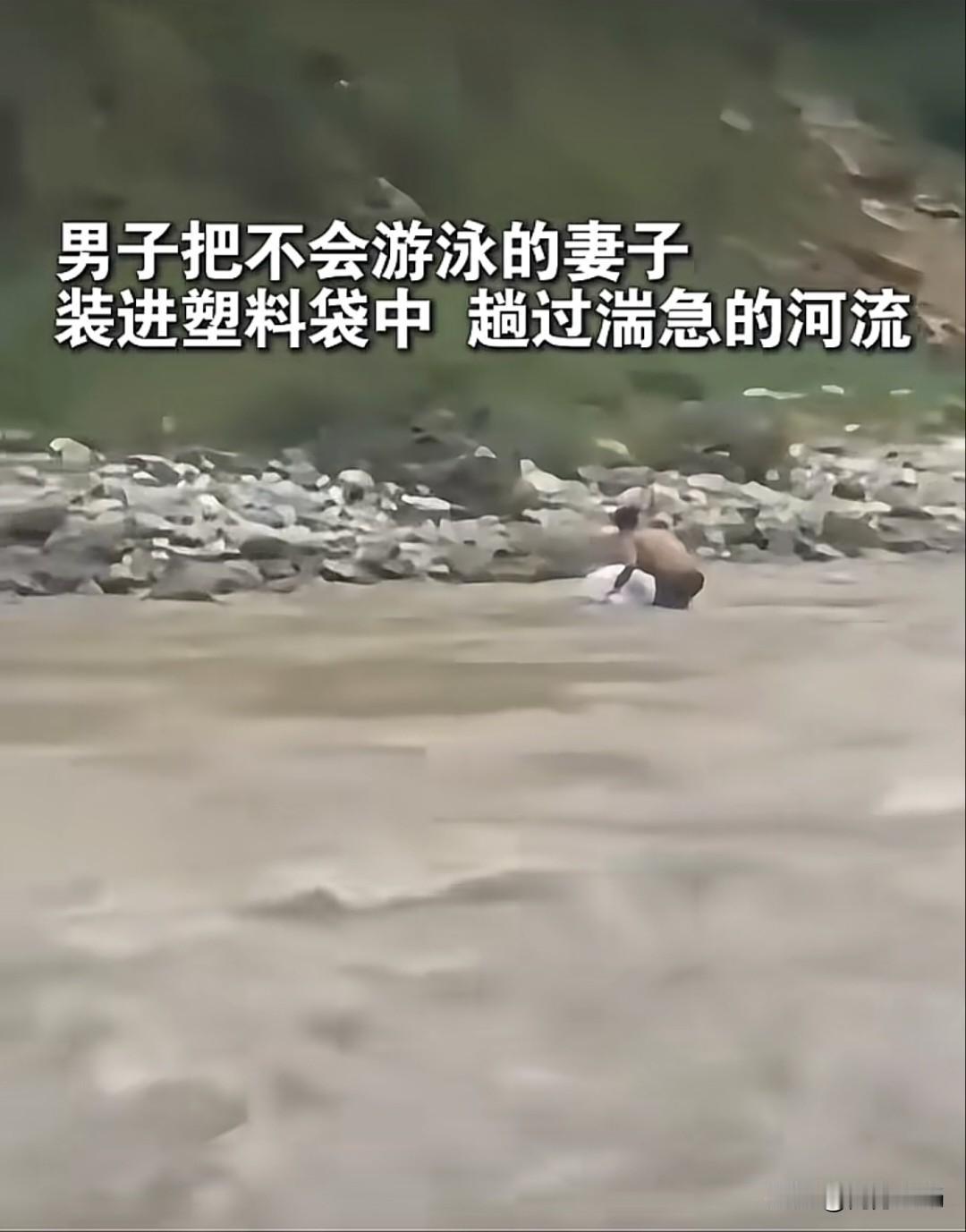 男子把不会游泳的老婆装进塑料袋中,趟过湍急的河流。看视频真捏把汗,袋子被水冲得直晃,妻子蜷在袋子里一动不动,全靠丈夫在河流里飞快挪到对岸。网友们都看呆了:“这要是袋子破了可咋整?”“这媳妇也太信任她男人了!” (图片来源于网络) 什么是爱?爱是什么?