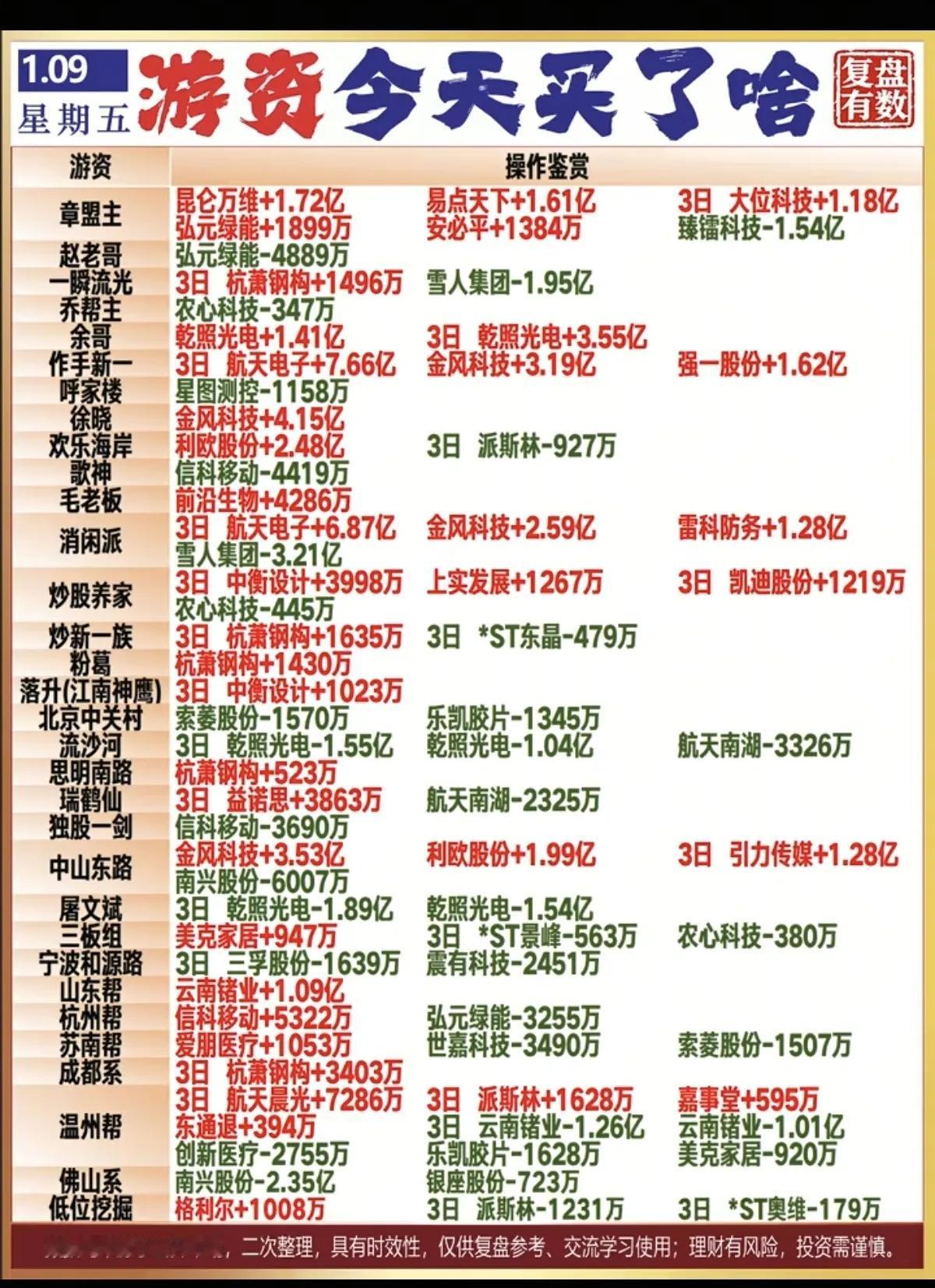 1月9日,周五A股大柚子买了啥!!! 章盟主买入昆仑万维1.72亿、易点天下1.61亿、3日买入大位科技1.18亿;余哥买入乾照光电1.41亿;作手新一3日买入航天电子7.66亿、金风科技3.19亿、强一股份1.62亿!!!