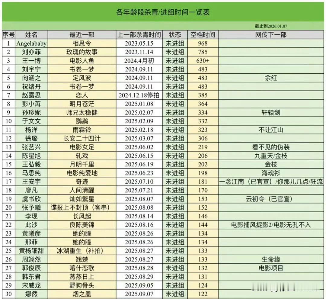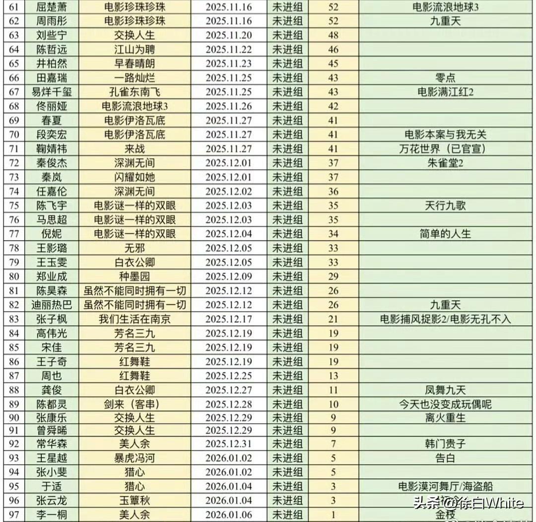 1月9日,当红演员未进组天数 影视寒冬不是说说而已,能无缝进组的艺人少之又少,在家待业的艺人比比皆是! 通过这张图可以清楚的了解艺人真实现状,哪些艺人正在被力捧,哪些艺人正在衰退,哪些艺人还有机会,哪些艺人被放弃了! 知道有些艺人有戏不拍,有些艺人没戏想拍! 内娱艺人的人生百态,大都在这几张图里! 知名艺人都如此,无名艺人该如何出头……