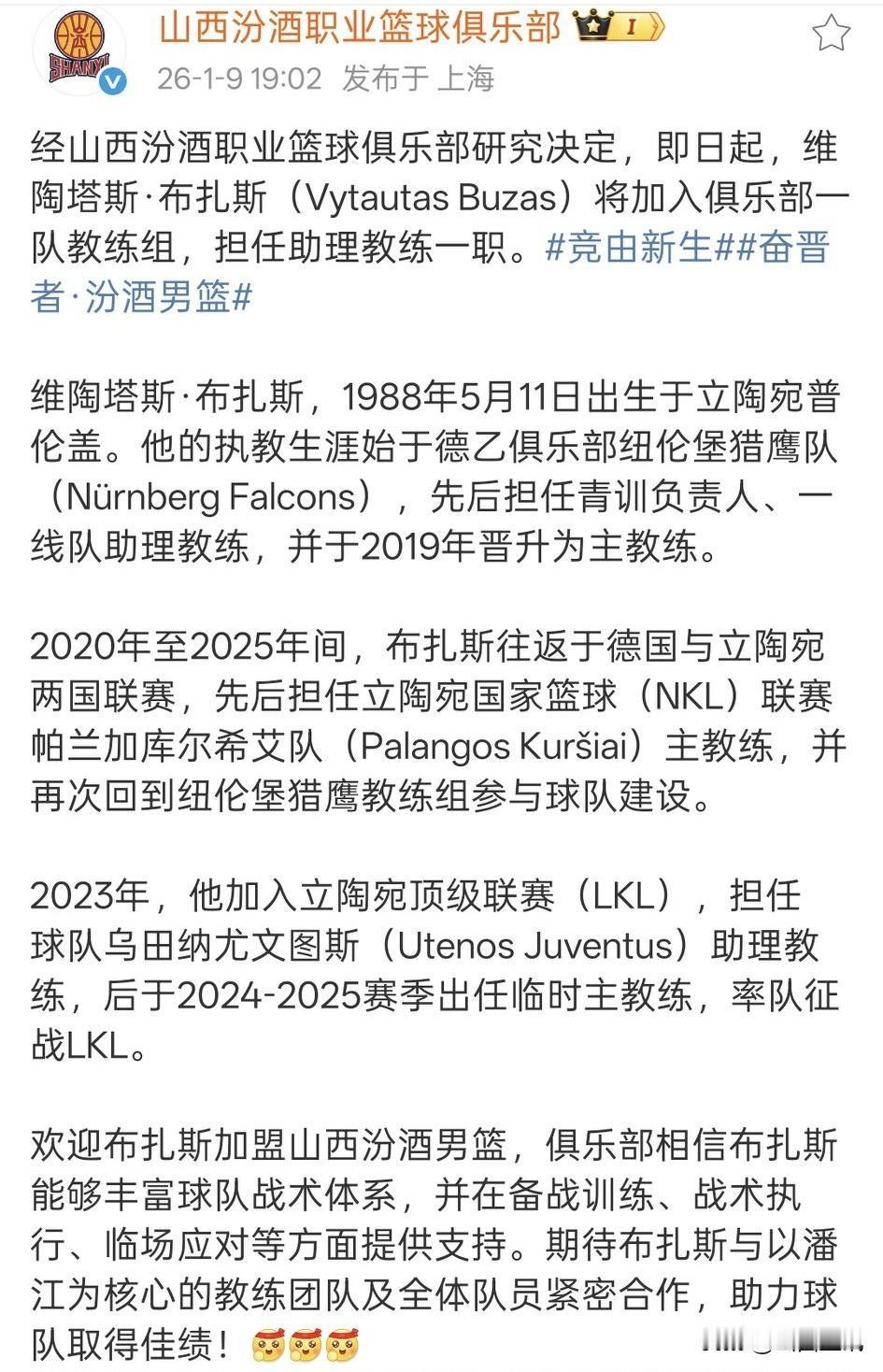 官宣:山西汾酒男篮教练组成员有变动,布扎斯成为潘江助理教练!今天山西汾酒男篮正式宣布:聘请立陶宛籍人布扎斯为助理教练,成为山西汾酒男篮教练组的一员。立陶宛国家男篮的水平在世界篮球圈属于顶级水平,布扎斯能带领立陶宛国家队做主教练,一定有过人之处,也具备世界级篮球技战术水平准。俱乐部管理层引进布扎斯,目的就是希望布扎斯将世界级执教理念带到山西男篮,以丰富山西男篮的战术体系,并在备战训练、战术执行、临场应对等方面提供最大的支持。这么说来,潘江有幸接触国际一流的篮球教练,能够吸取到更先进的技战术打法,无论对球队,还是对个人无疑将是非常有益的事情。球迷希望布扎斯与以潘江为核心的教练团队紧密合作,带领山西汾酒男篮向新的更高的目标迈进!