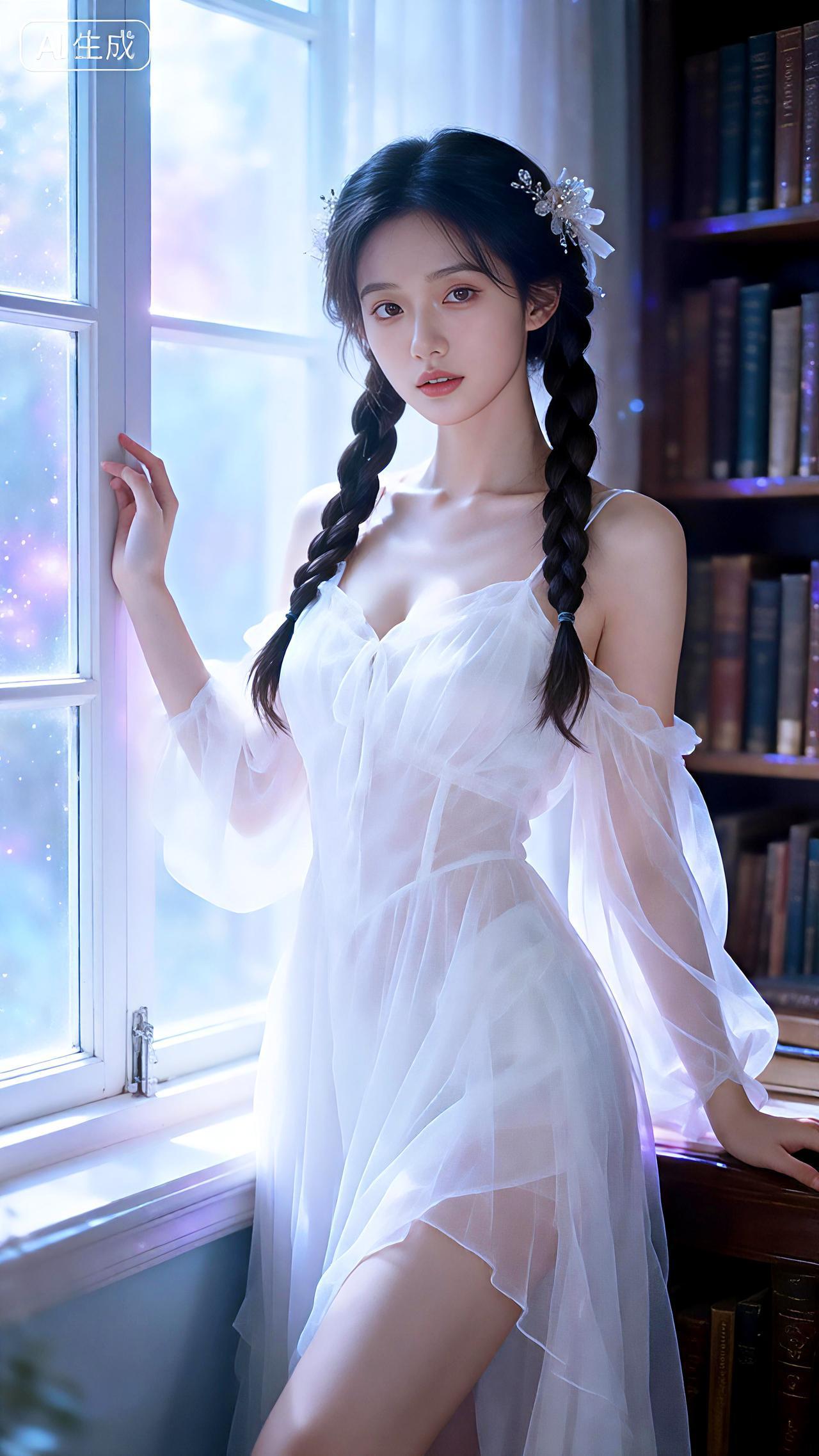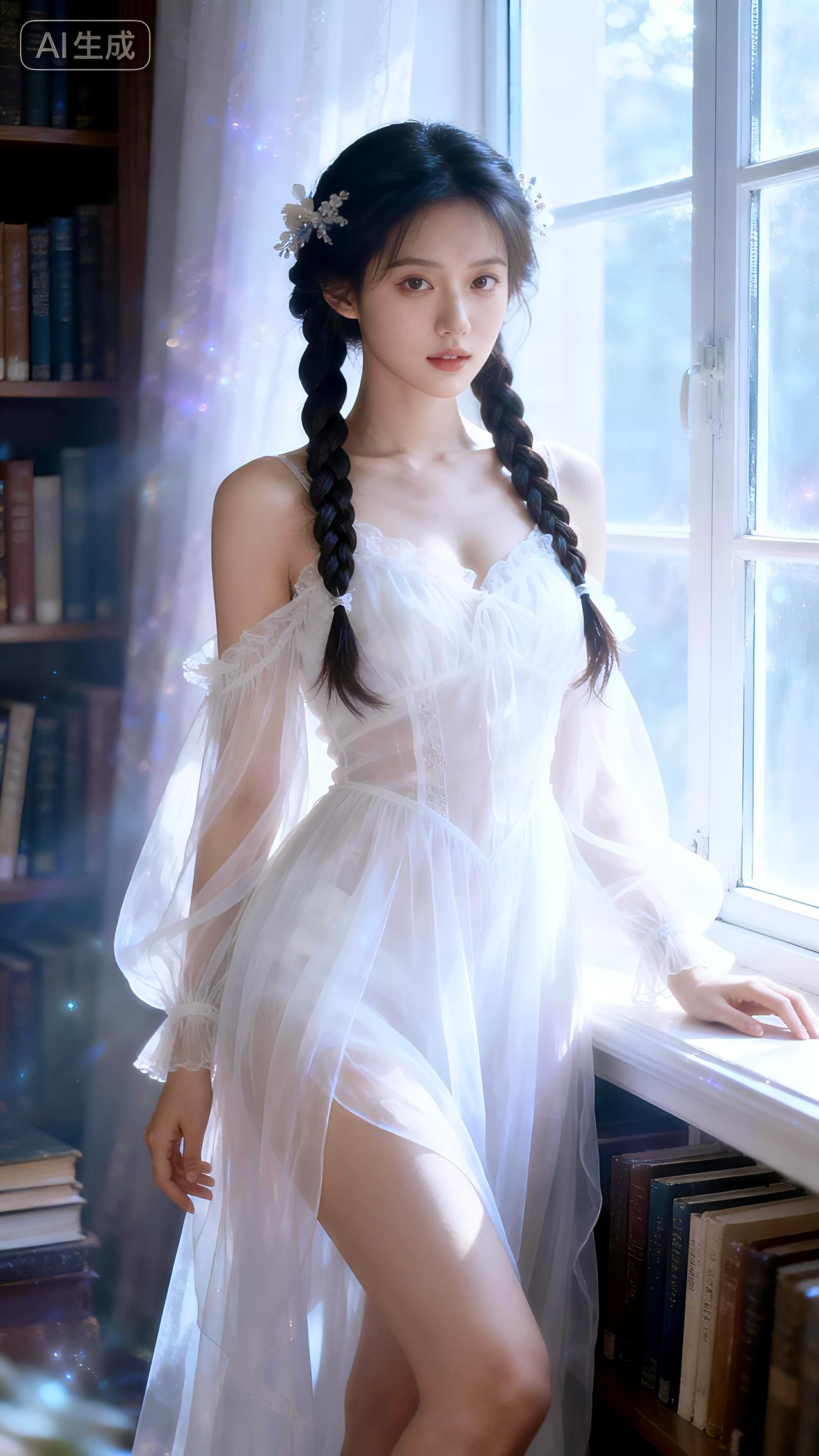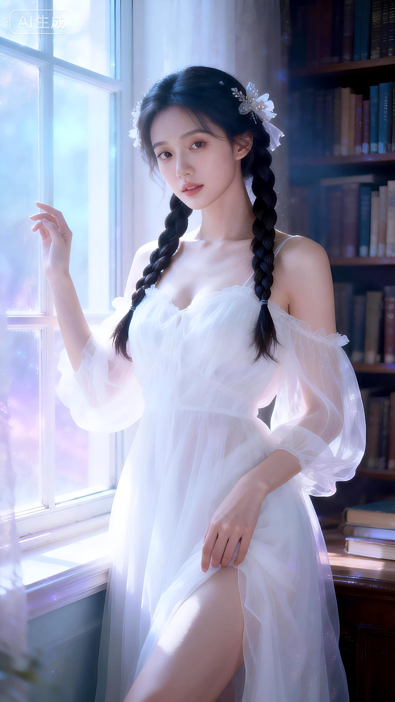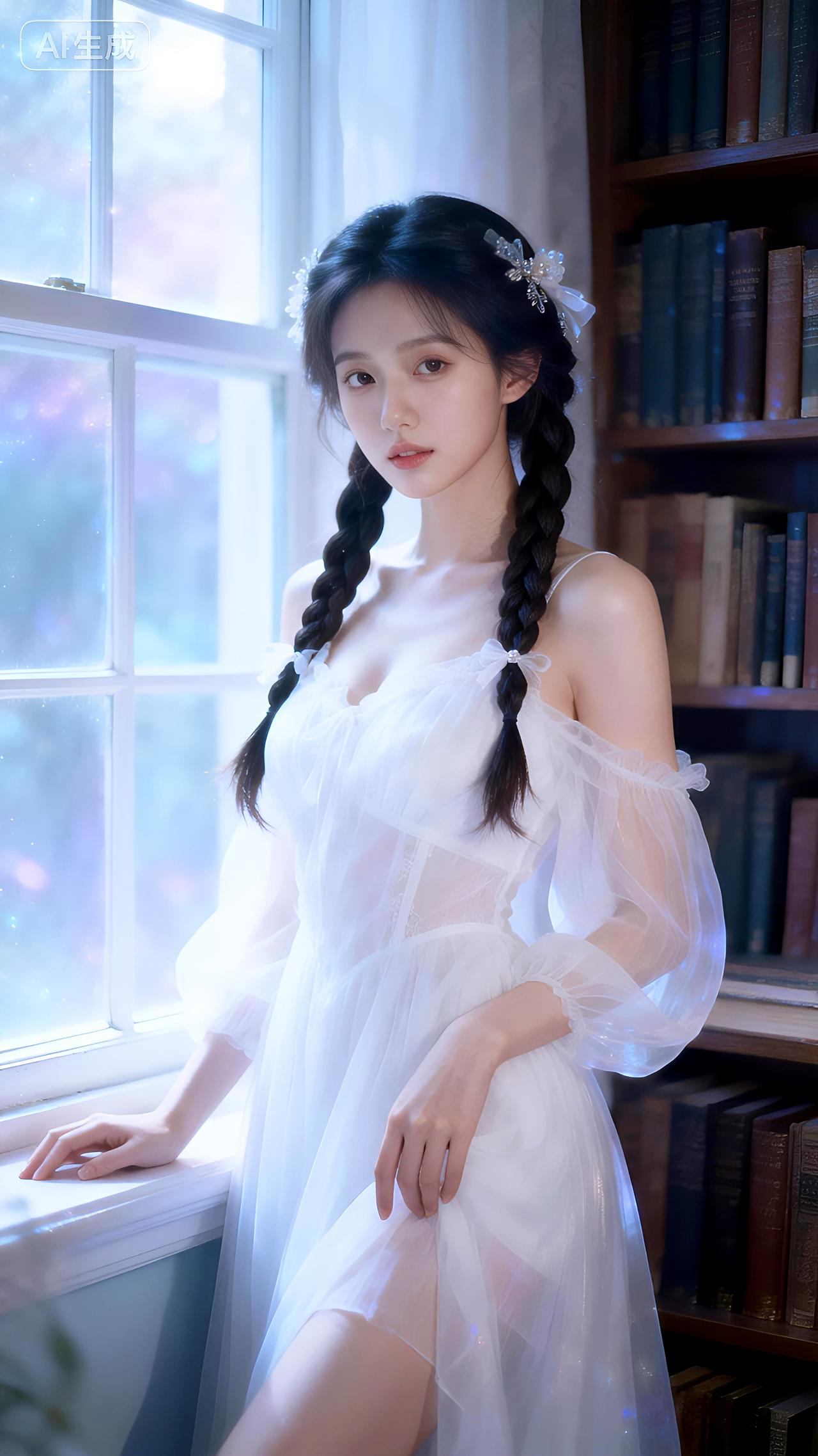 飘窗光线绝了,麻花辫和裙子搭得刚好,拍出来肯定仙!