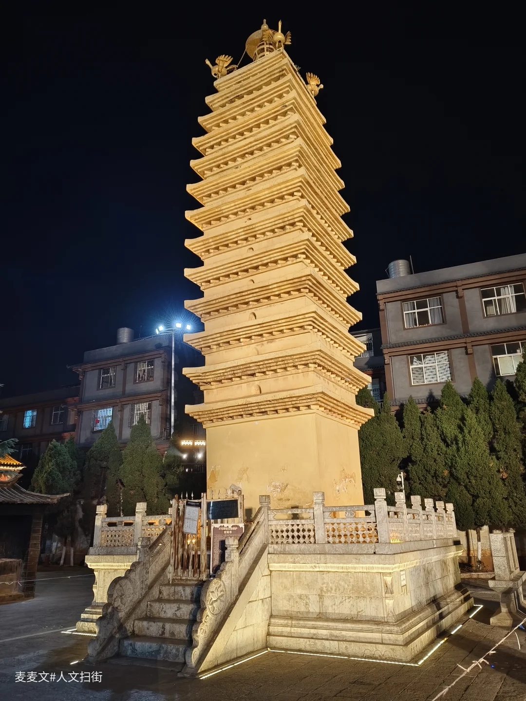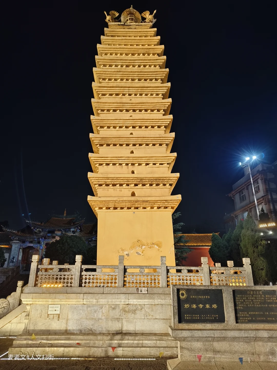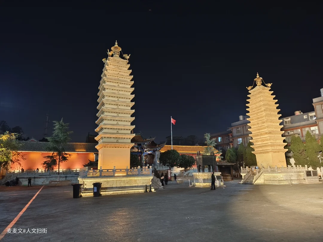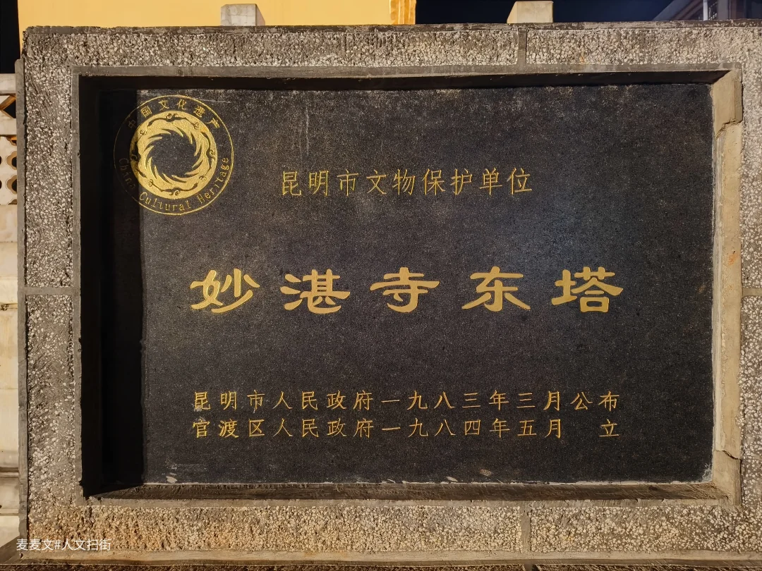 云南省昆明市官渡古镇妙湛寺前修建有十三层密檐方形实心砖塔两座,始建于元泰定四年(1327-1335年间)。多次重修,于明成化年间竣工,原为双塔。西塔于清道光十三年(公元1833年)地震被毁,尚存妙湛寺东塔。现在的西塔是2001年重建的。塔高17.5米,为方形台基,边长5.5米,1-12层四面有佛龛。塔顶四周各立一只迦娄罗,俗称“金鸡”,故此塔又称“金鸡塔”。东西两塔对峙,每值冬秋夜晚,玉兔东升,两塔倒影似笔尖,阴影移动,犹如神人大师挥动大笔,书写诗篇,赞美天地、祝福人间,故称“笔写苍穹”,为官渡八景之一。