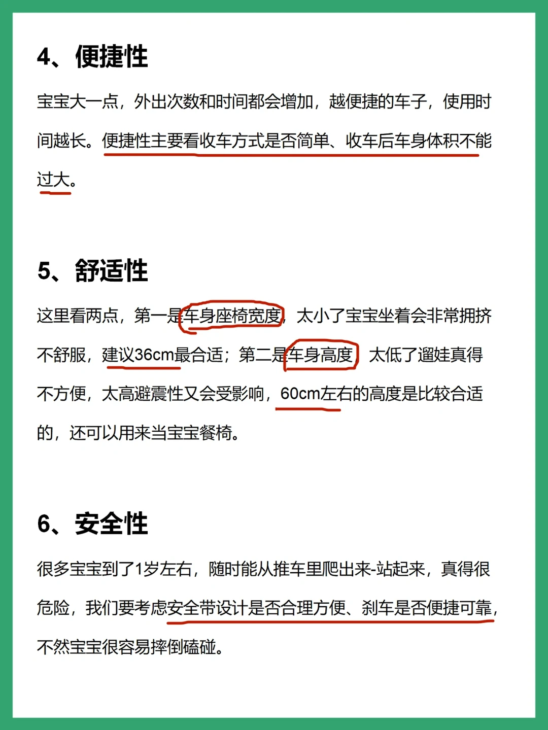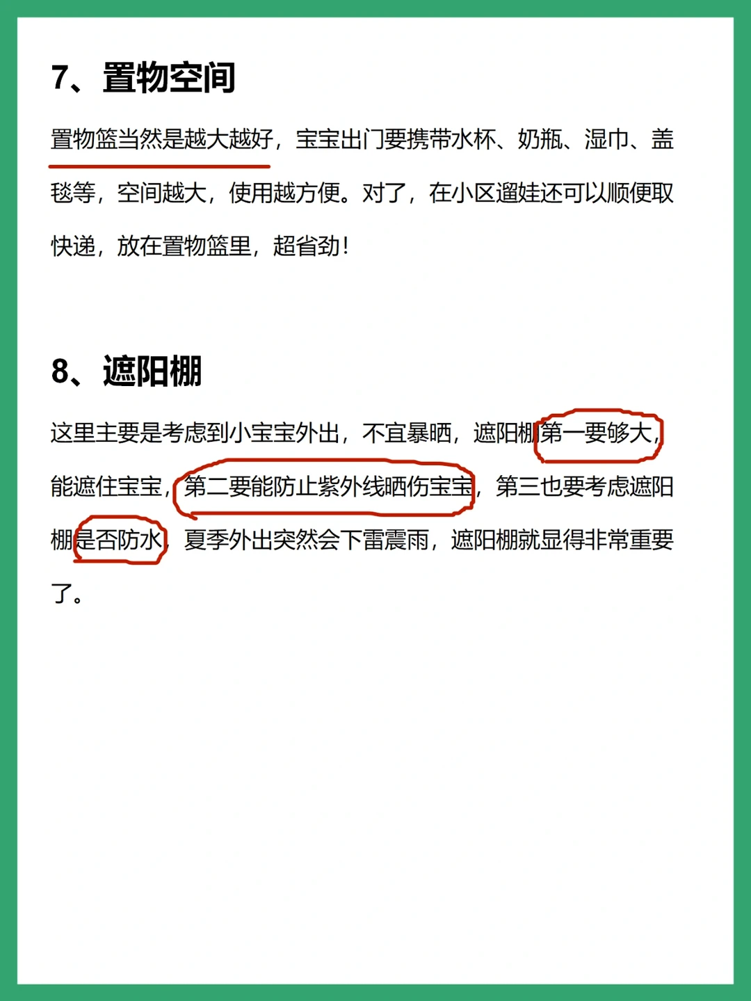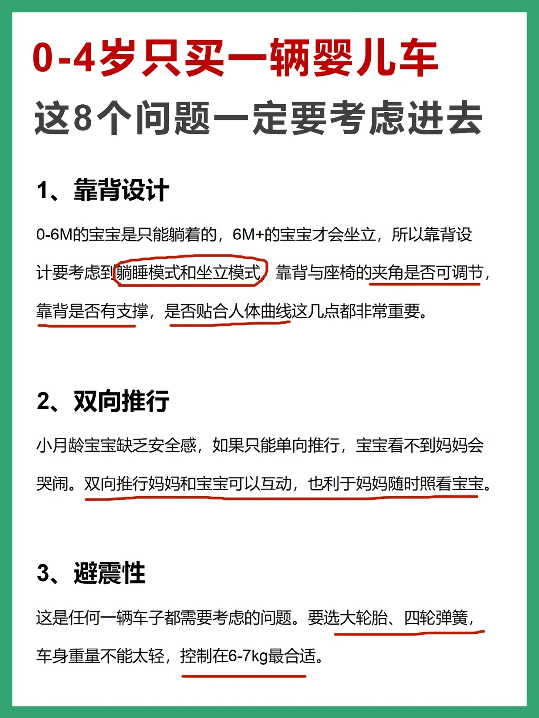 ➡️其实买婴儿车不需要看那么多参数和专业术语,考虑它的靠背设计、双向推行、避震性、便捷性、舒适性、安全性、置物空间、遮阳棚这8点就够了。当然,难免在婴儿车选购过程中,会出现纠结的点,这个就看个人取舍了,什么是你认为重要的,什么是可有可无的。