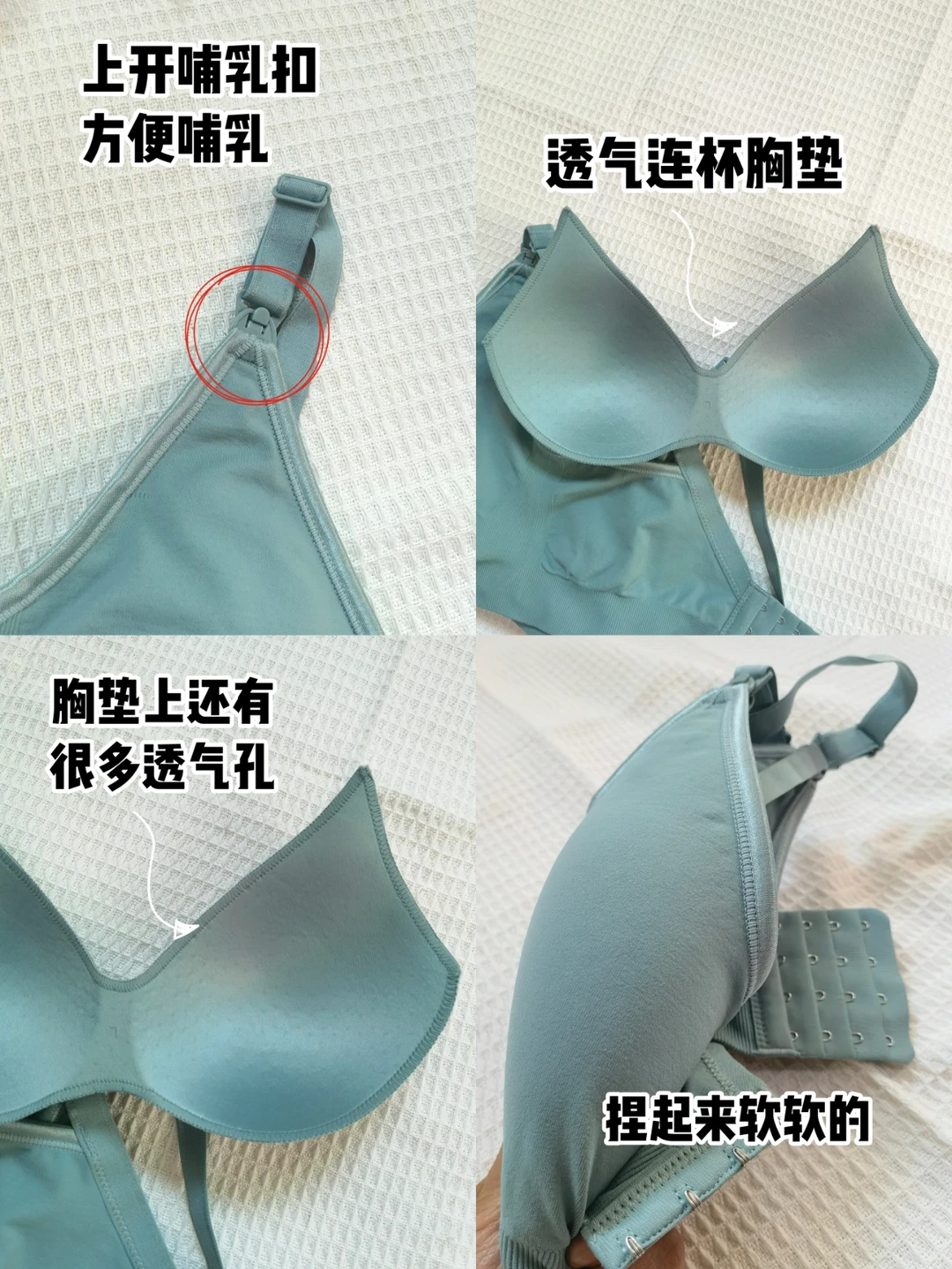 推荐十月结晶无缝哺乳内衣,据说是意大利无缝编织工艺,具体啥工艺咱也不了解,但穿上确实挺舒服的,软软的,比较贴合xiong部,涨奶时也不会勒得疼。胸垫是蜂窝透气孔,不会闷汗,还可以拆卸,喂奶也很方便,直接解开哺乳扣就行。