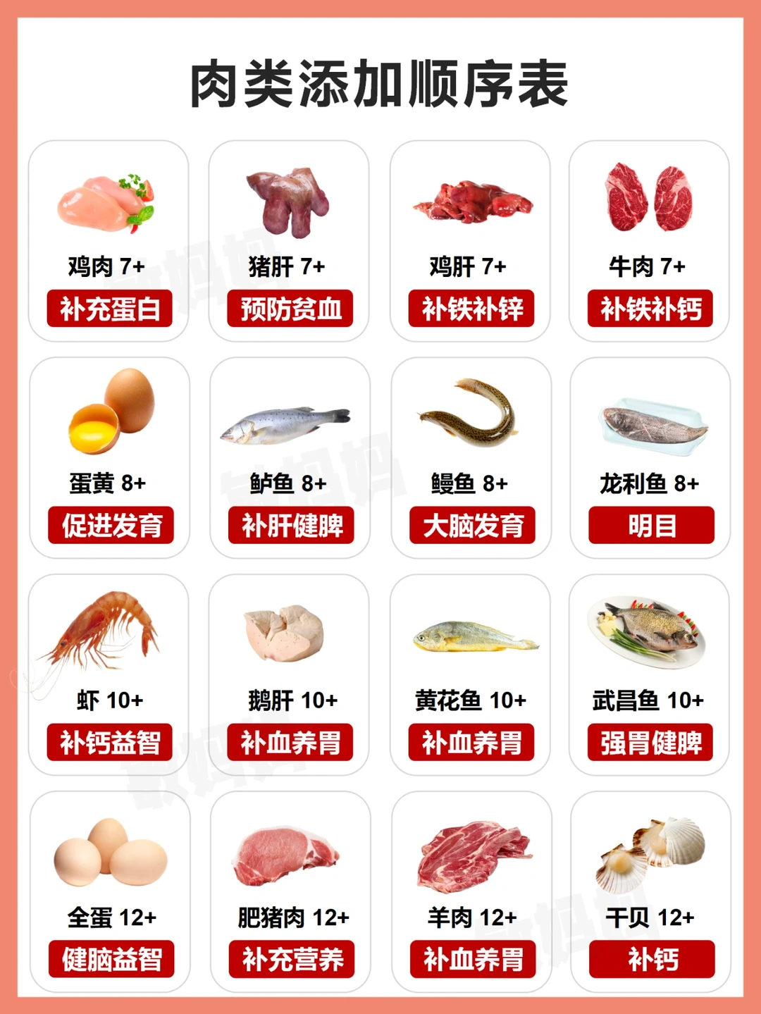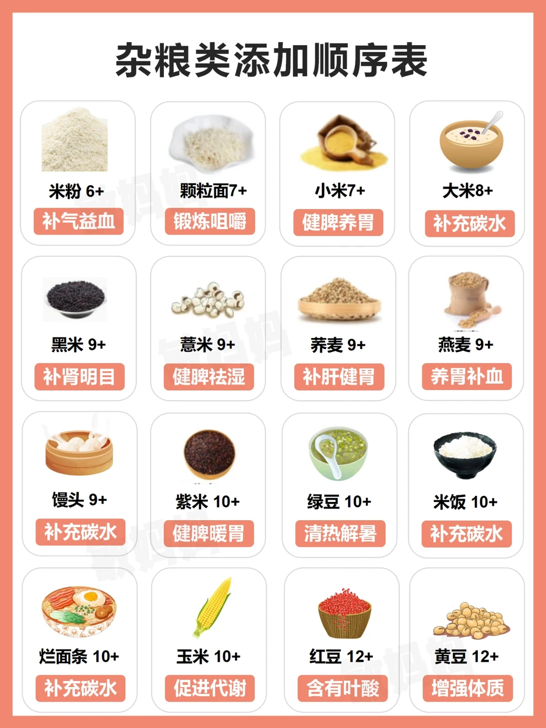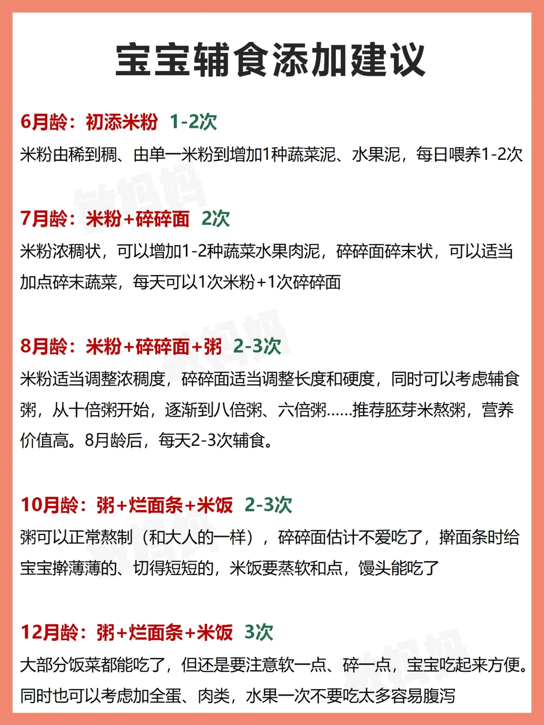 宝宝6月龄左右,就可以开始吃辅食了~米粉怎么吃,蔬菜泥水果泥肉泥什么时候加,什么时候开始喝十倍粥,什么时候吃面条、米饭,每天吃几顿辅食……