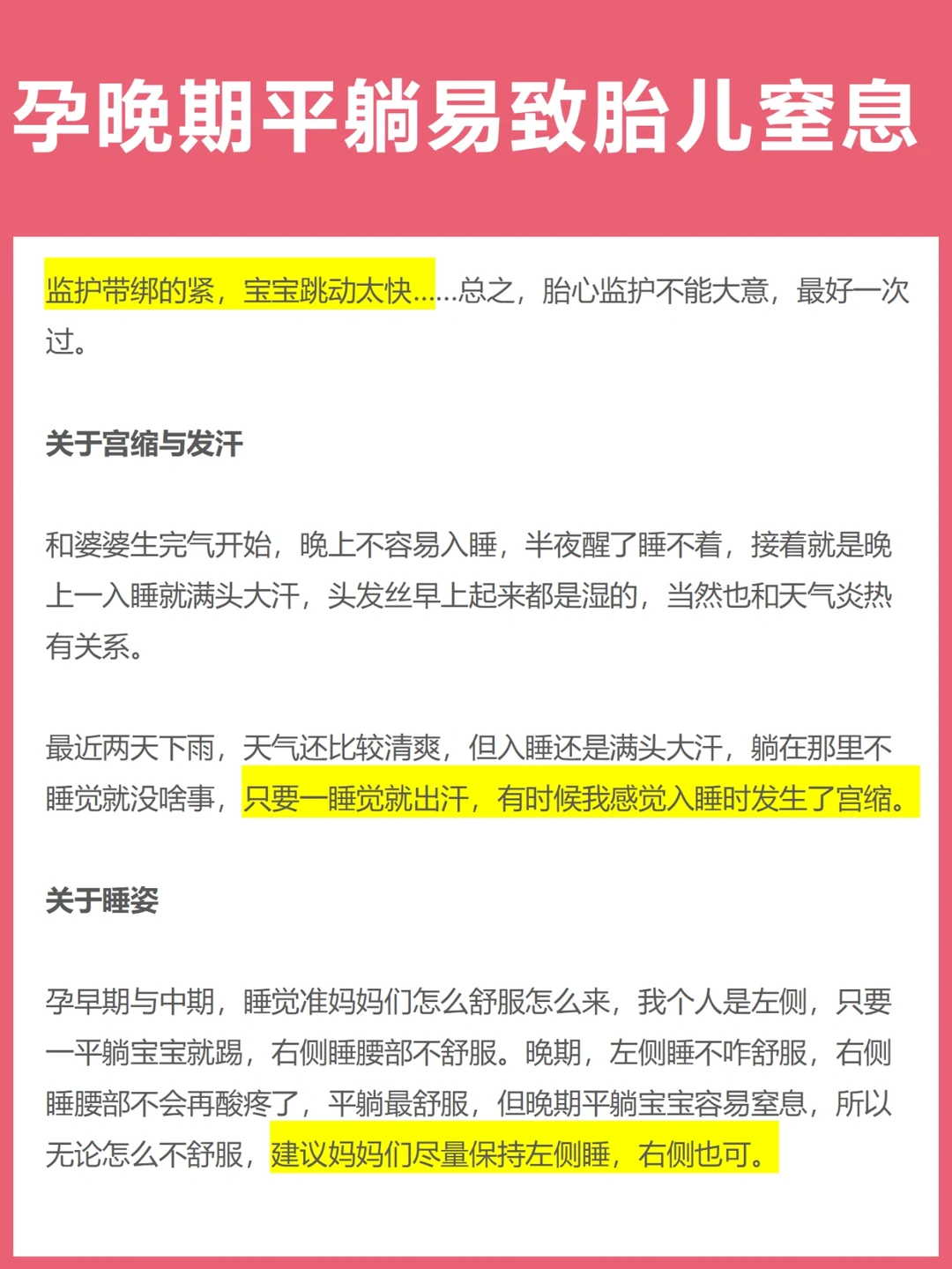 ❤️37周,不能平躺着睡了,容易导致胎儿窒息,但自己侧着睡,有时候挺难入睡,还经常出汗,感觉可能发生了宫缩,不睡觉不出汗,一睡觉就出汗,估计宝宝在肚子里不舒服吧。