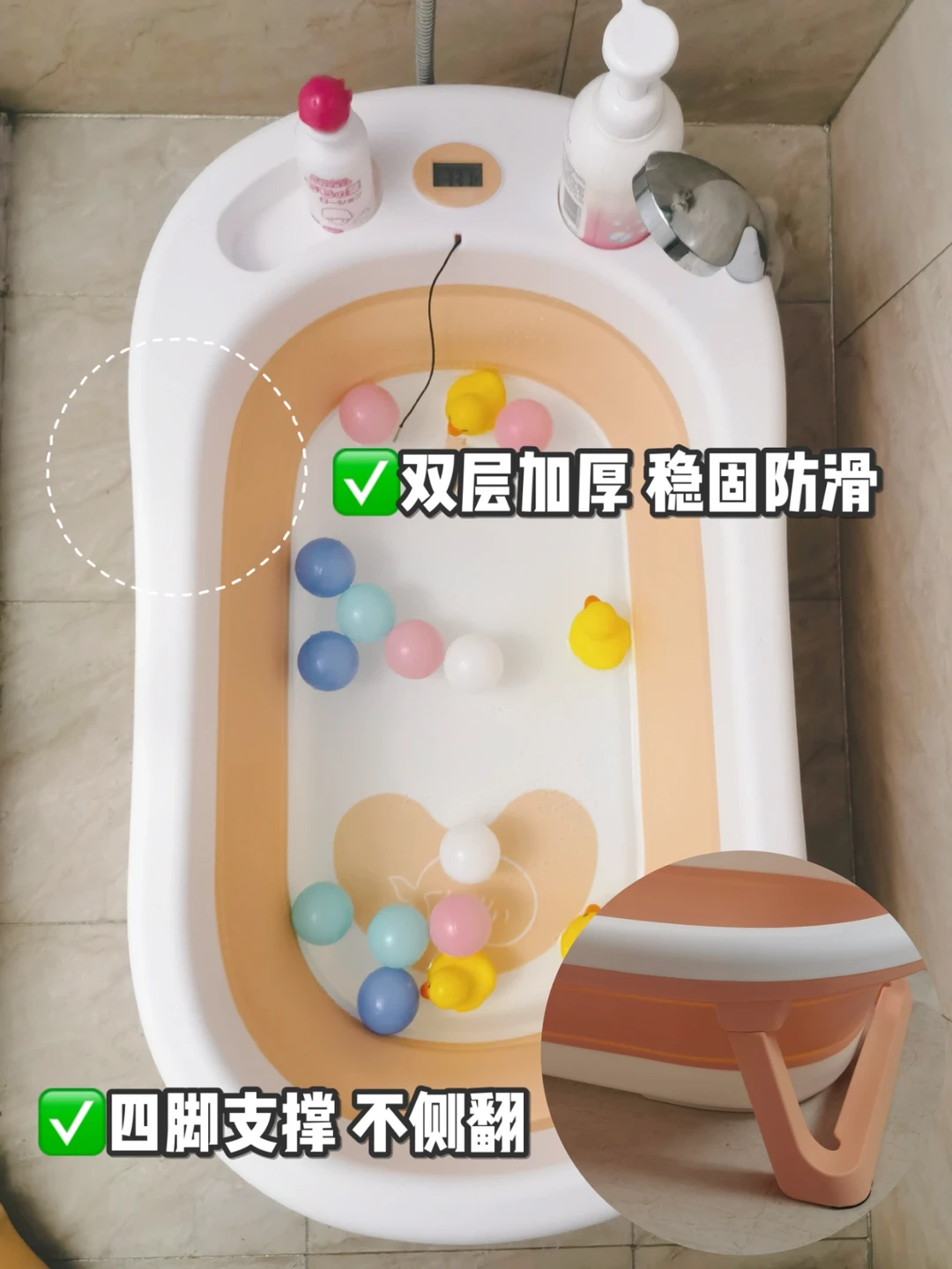 浴盆的四角和底部都是双层加厚的,稳固防滑不怕侧翻✅用完可以折叠收纳起来,小小一片不占空间~✅