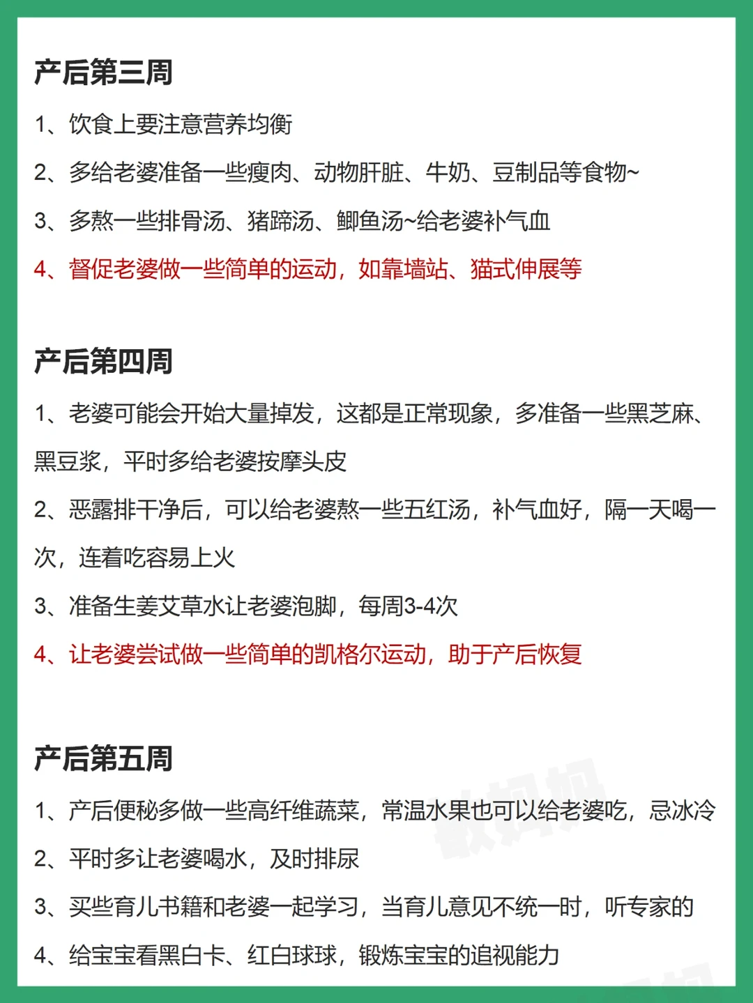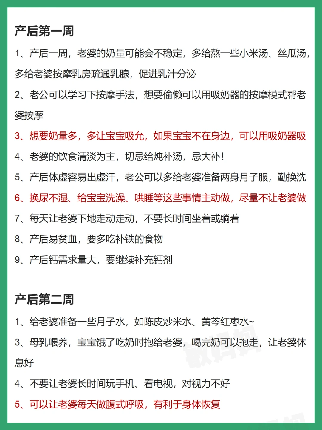 ⭕产后7天内,清淡饮食,多喝水,多喝菜汤、小米汤,助于产奶