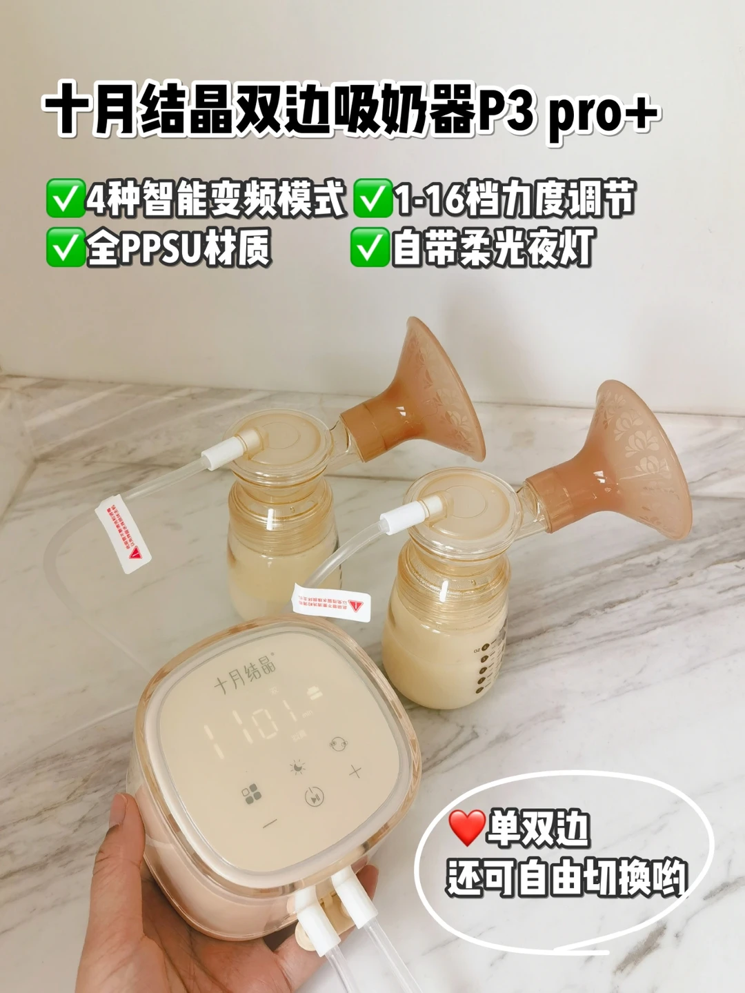 十月结晶双边吸奶器P3 pro+就还不错,它有催乳、吸乳、拟真、阵吸4⃣️种模式,每种模式有16个档位,档位间的力度差很小,容易调控,新手妈妈也可以无痛吸奶。