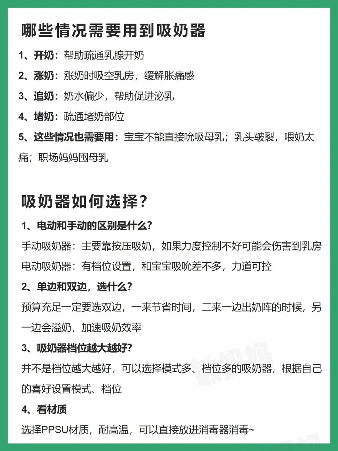 如果准备母乳喂养,老公记得给老婆选个好点的吸奶器,吸奶器在开奶、堵奶、追奶方面都能用上。