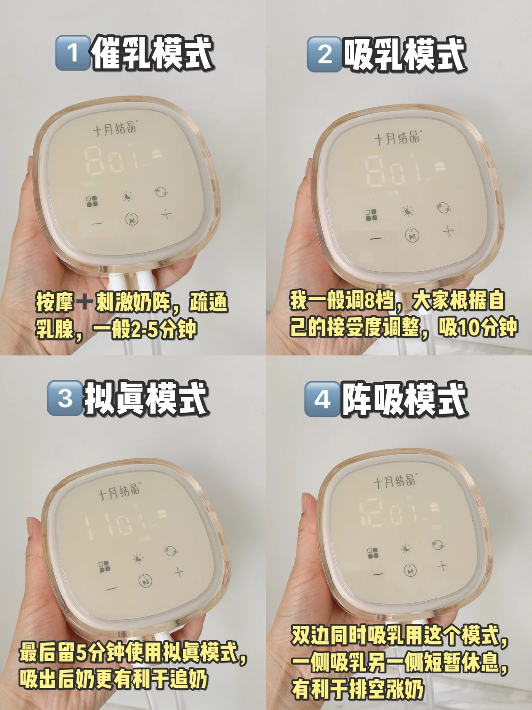 👩🏻👩🏻👩🏻使用时,可以先用催乳模式按摩出奶阵,再转吸乳模式,大吸力深度排空后奶,之后,也可以根据自身需求尝试拟真模式和阵吸模式。