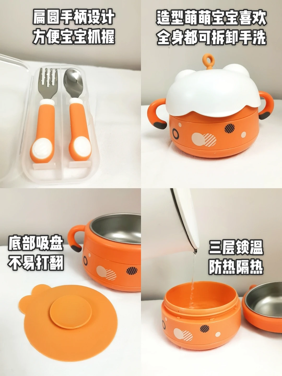 ‼️关于辅食碗和注水碗,这两个是不同的东西,辅食碗类似我们平时吃饭的小碗,但它是防摔的,还可以蒸鸡蛋。注水碗比较适合宝宝吃饭慢🤤还没吃完饭菜就冷的情况,我家冬天用得较多,夏天也可以加冷水使饭菜快速降温。