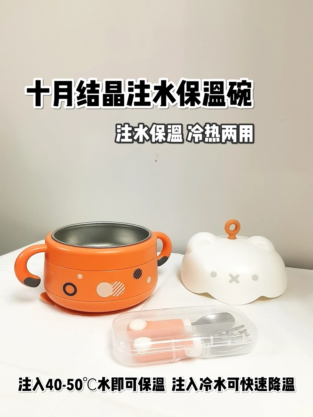 十月结晶注水保温碗,冷热两用,注入40-50℃温水就可以长时间保温,不用担心饭菜冷掉,注入冷水可以快速降温,不用担心烫菜烫饭伤到宝宝~