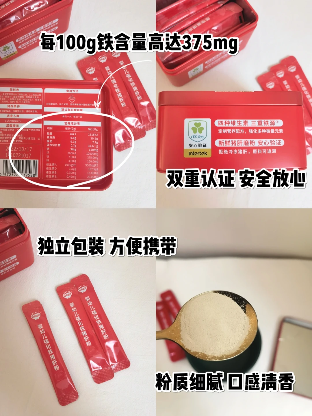 👩🏻秋田满满强化铁猪肝粉就不错,是按照GB22570/婴幼儿辅食营养标准制作的,ITS认证过,不用担心安全问题。它是独立一小包一小包包装的,每次开一袋就行,每袋猪肝粉基本可以满足6月龄宝宝每日所需铁的75%(每100g含铁量高达375mg),也比较好吸收,妈妈们不用再担心宝宝缺铁问题~