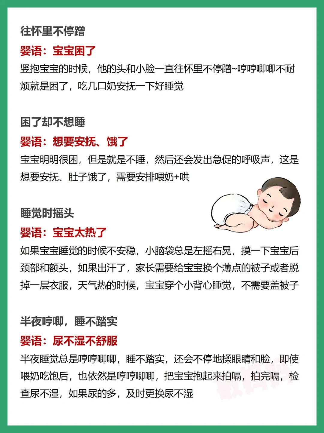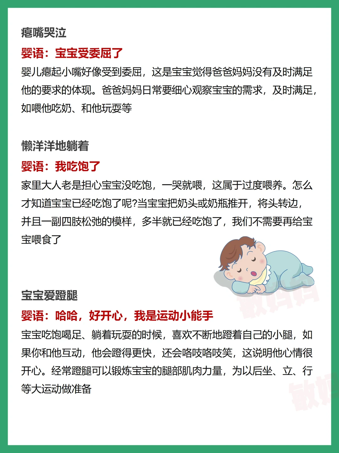 其实作为父母👩🏻,在宝宝成长过程中,我们要了解宝宝的这些哭闹“婴语”,了解宝宝的需求并及时满足,这就是给宝宝最大的爱~❤️