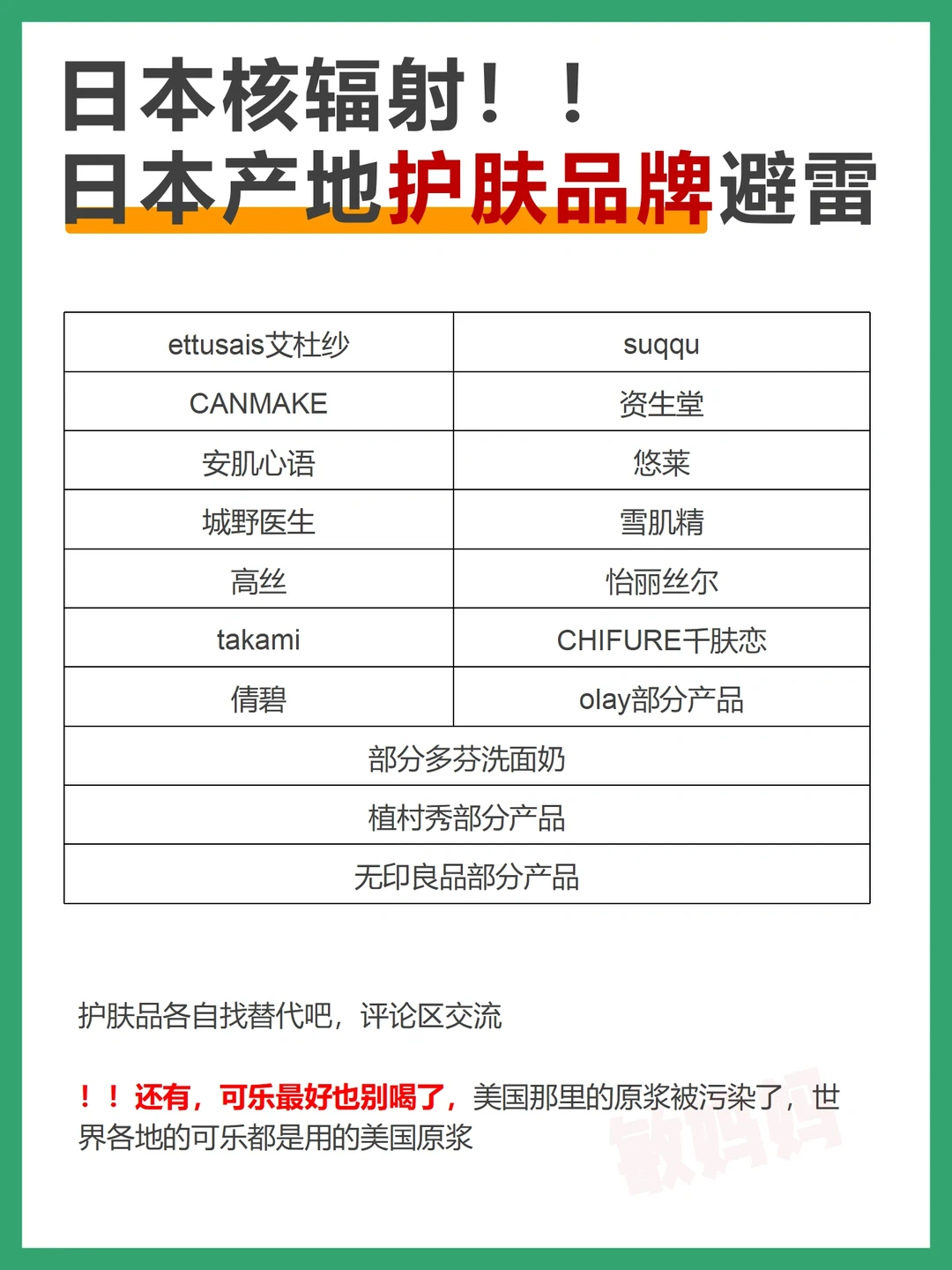 由于日本核废水问题!大家在买母婴用品、护肤美妆品之前先看下制造地区再入手,一定要避开核污染区域! . 核辐射地址分别是:福岛县、群马县、栃木县、茨城县、宫城县、新泻县、长野县、琦玉县、东京都、千叶县 . 目前已经被爆出来的食品有:卡乐比麦片、和光堂二段婴儿奶粉、日本养命酒、新泻大米、儿童果冻、海鲜等,只要发现日本食品是来自上述10个地区就不要购买。较好的办法就是暂时先不买任何日本进口食品 . 日本核辐射母婴用品,已列出替代清单 日本核辐射护肤用品,欢迎互动一起交流~