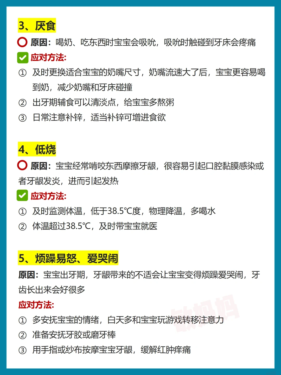 图3-图5详细写了宝宝出牙7种症状的原因和应对方法,新手爸妈可以自行对照