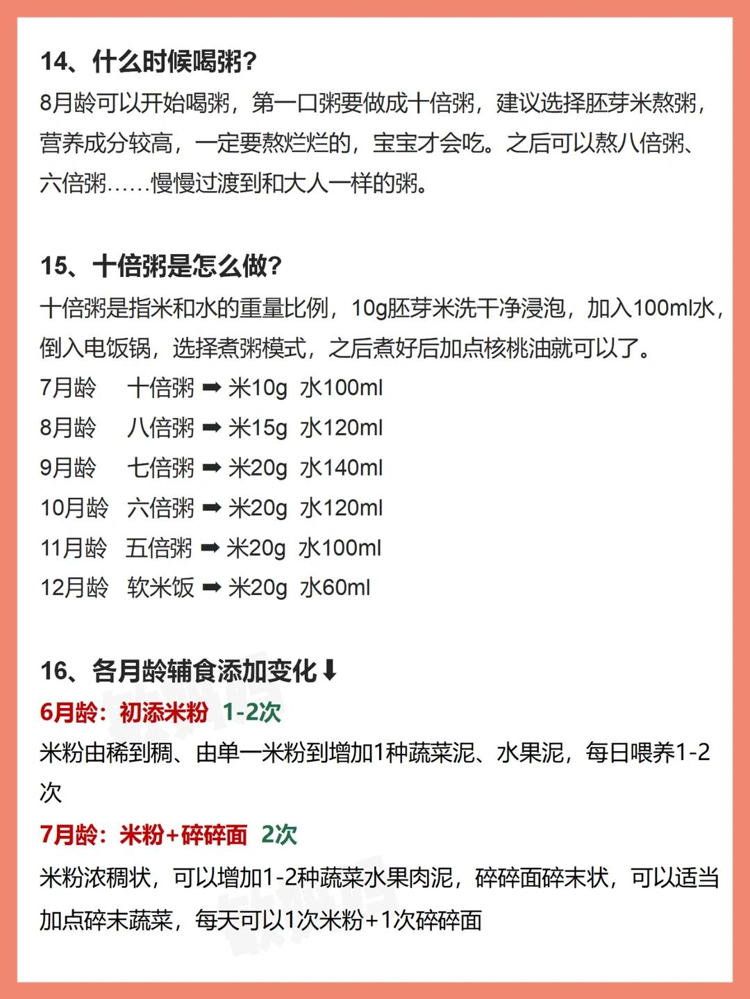 8⃣️月龄➡吃米粉+碎碎面+粥,辅食粥,从十倍粥开始,逐渐到八倍粥、六倍粥……每天2-3次辅食