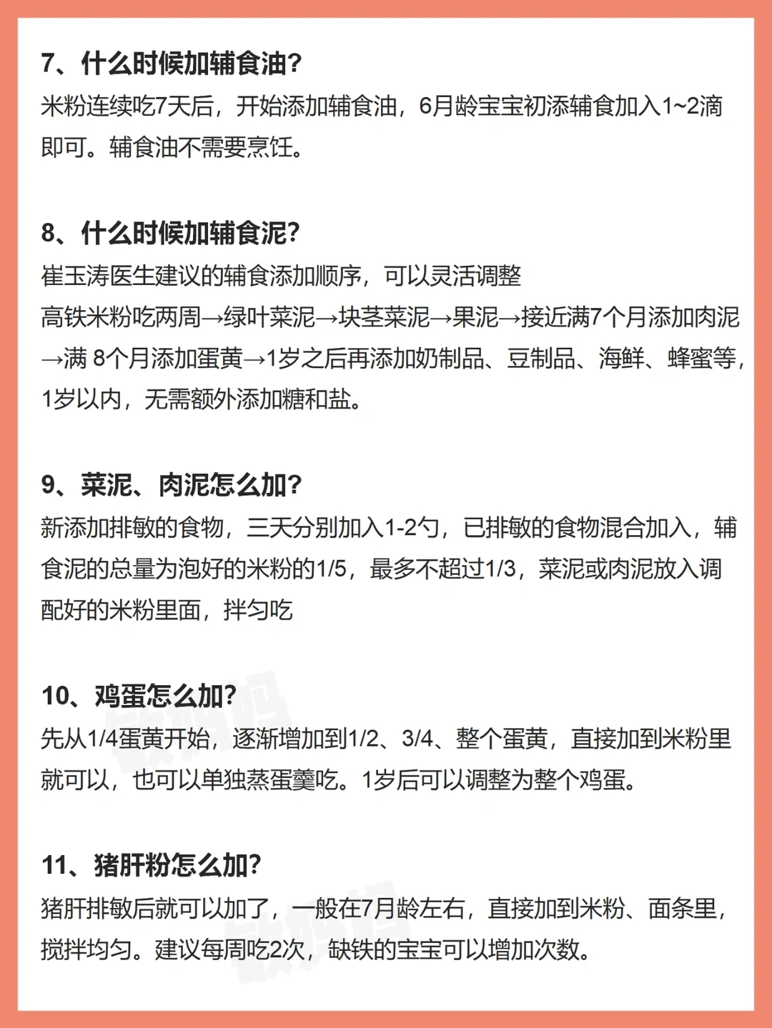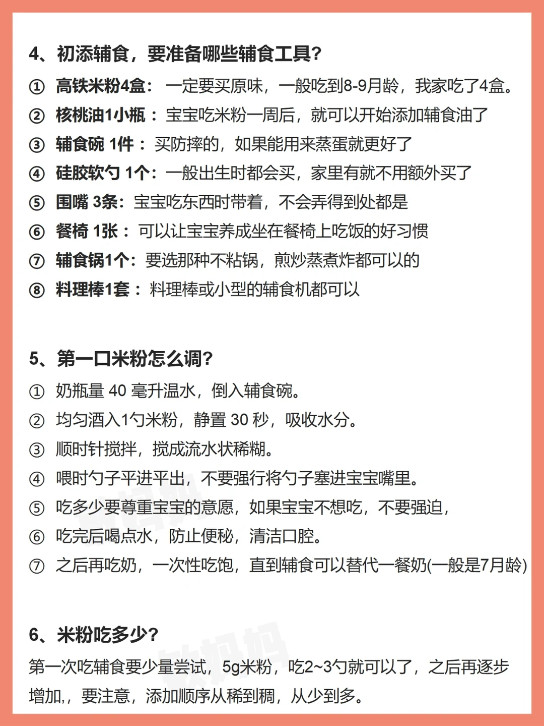 6⃣️月龄➡吃米粉,米粉由稀到稠、由单一米粉到增加1种蔬菜泥、水果泥、肉泥,每日喂养1-2次