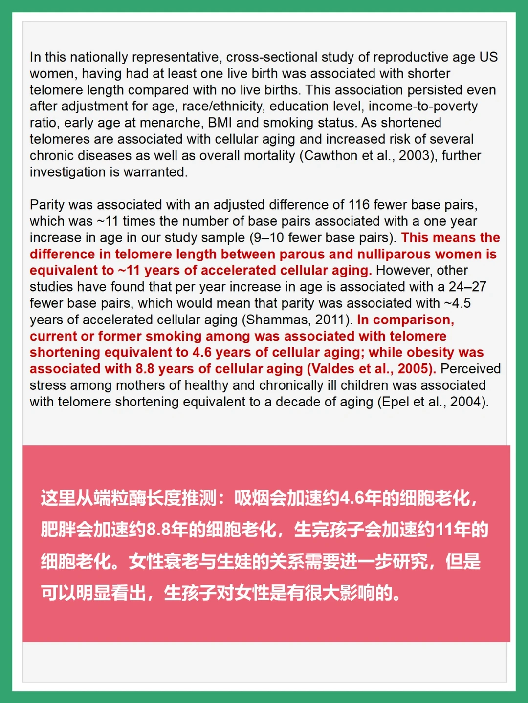 这份报告中发现生过一个孩子的女性比未生育女性端粒平均短了4.2%。这意味着碱基对少了116个,这相当于细胞加速老化了11年,比吸烟喝酒对身体的影响还要大‼️
