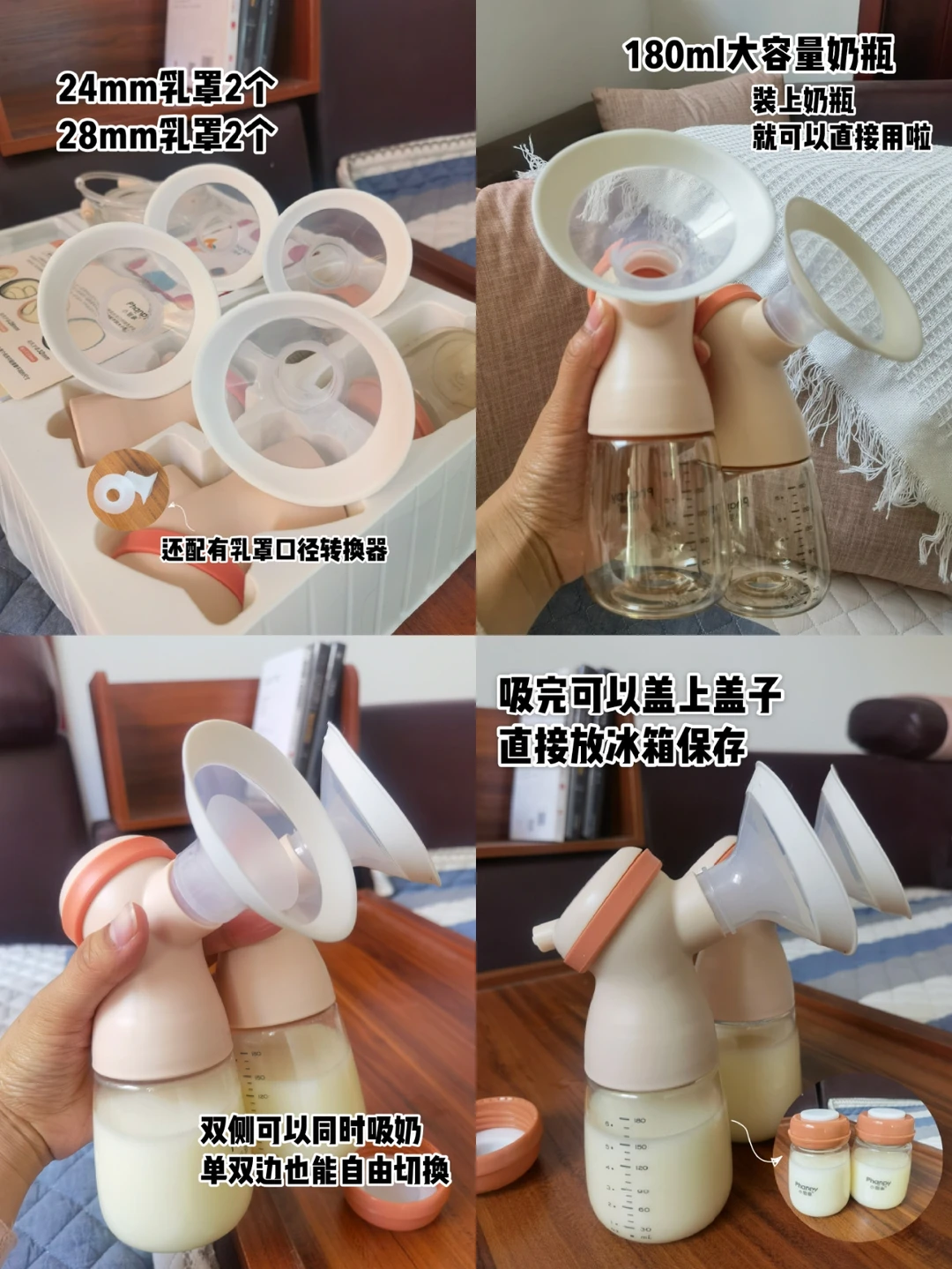 大家用的时候,直接把奶瓶安上,电源插上就可以了。有泌乳➕吸乳➕按摩➕变频4种模式,大家根据自己情况使用。