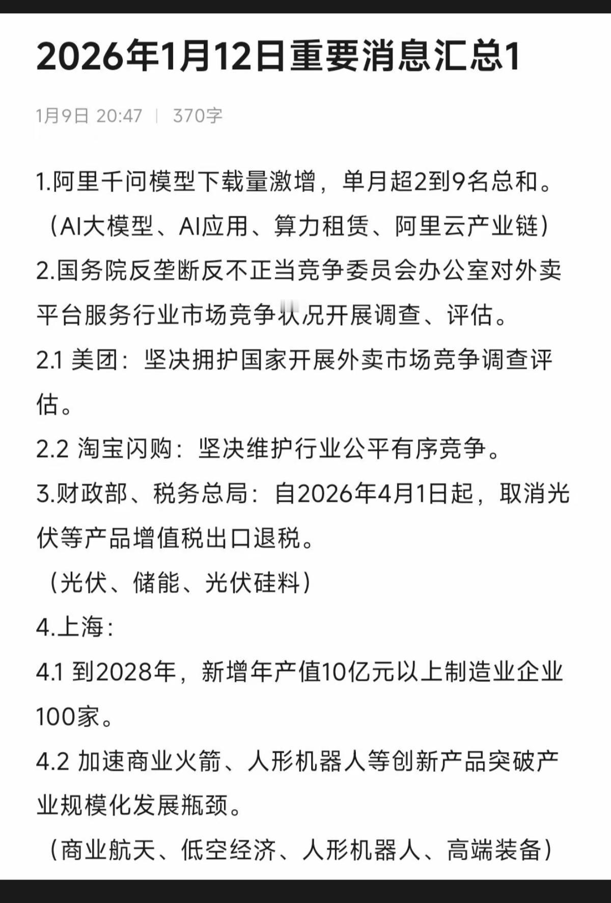 1.12周一 财经热点 消息汇总! 1.阿里千问模型下载量激增 2.4月1日起,取消光伏等增值税出口退税 3.商业航天,低空经济 4.消费金融 5.铂钯,调整期货保证金