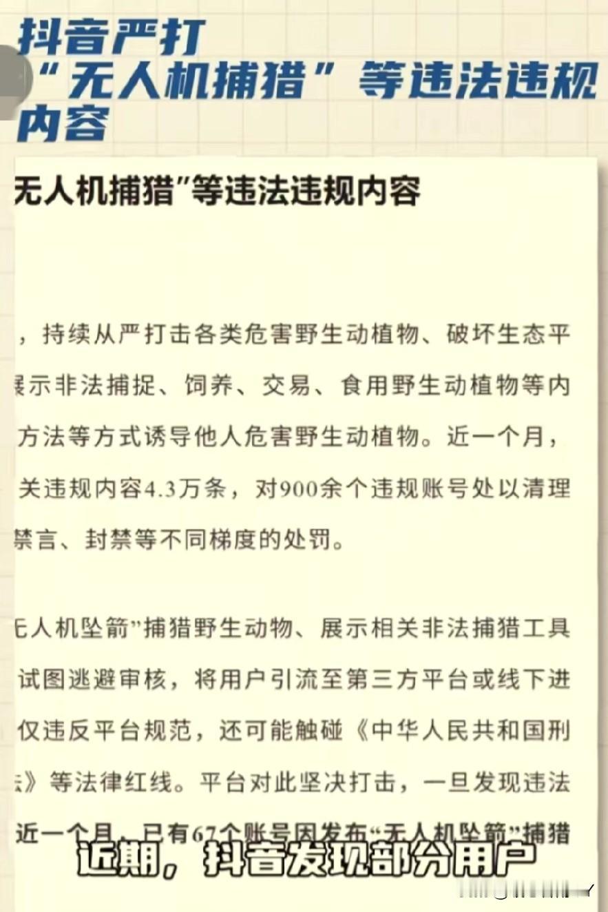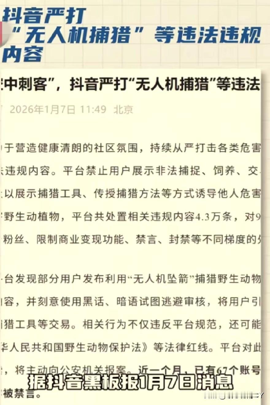 抖音近日发布通报:67个利用无人机坠箭捕猎账号被禁言,4.3万条违规内容被清理,900余个账号受到分级处罚。 这些账号颇为隐蔽,用“牙签”代指箭、“佩奇”代指野猪,暗度陈仓,还引流售卖改装无人机和捕猎箭具。 野生动物是生态的基石,不是猎杀目标,无人机本是便民工具,不该沦为“空中屠刀”。 这种行为既触犯《野生动物保护法》,更是对生命的漠视,还可能误伤人类、破坏生态平衡。 每一个生命都值得尊重,保护野生动物就是保护我们自己的家园。 为平台严厉打击举措点赞!也呼吁大家拒绝传播捕猎相关内容,发现违规情况及时举报,共同守住人与自然和谐共生的底线,别让地球只剩人类孤单地前行。 冬日生活打卡季抖音直播封禁 抖音账号