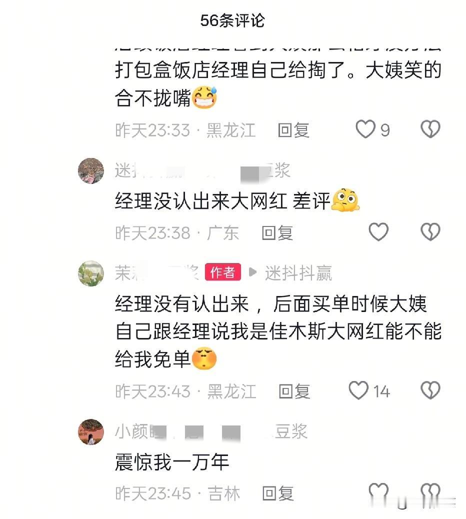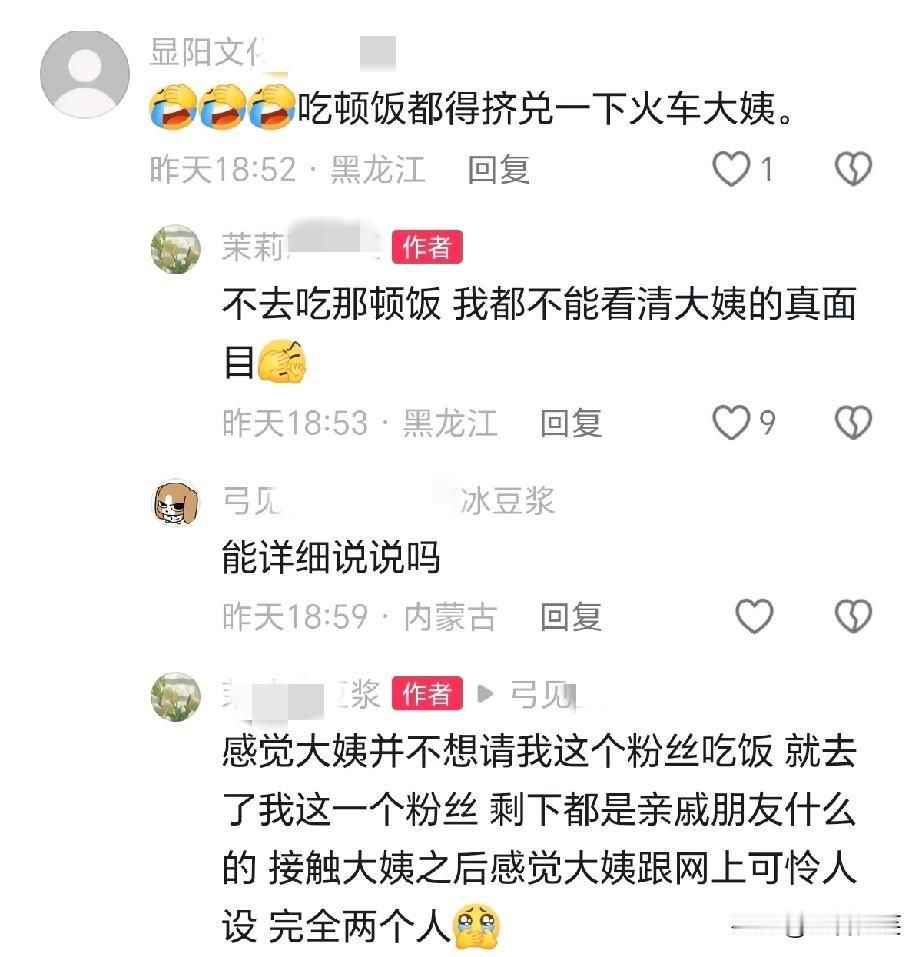 铁路大姨这次百口难辩了,羊排店老板提供了录音,大姨亲口说“我是个网红,刚红,能只挣这10000块钱嘛”! 后又被网友爆料,大姨生日宴只请了她1个粉丝,其他感觉全是大姨的亲戚朋友,大姨跟网上可怜人设,完全是两个人。 大姨嘴上说请粉丝吃饭,对粉丝又爱搭不理,一边吃饭一边开直播:“谢谢家人们祝大姨生日快乐,谢谢家人们”! 看似礼貌打招呼,实则借着生日开直播“敛财”,大姨都过生日了,“家人们”不刷点礼物过意不去吧! 更可笑的是,饭店的经理没有认出大姨,大姨却自报家门:我是佳木斯大网红,能不能给我免单?[捂脸]