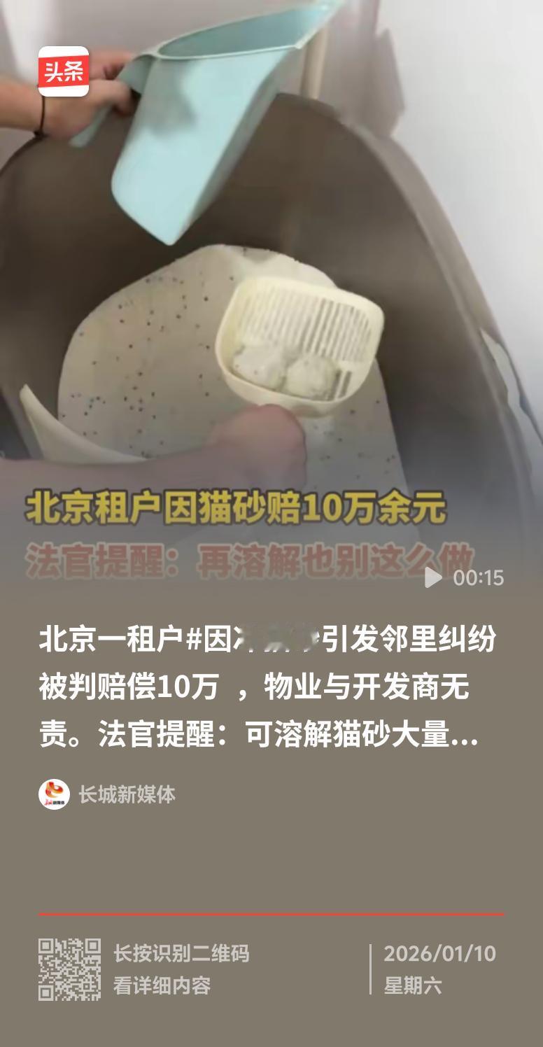 现在养宠物的人越来越多,猫砂使用也很常见,但北京张女士频繁往下水道冲“可溶解”猫砂和湿巾,结果惹上大麻烦。她是联排别墅租户,她这么一冲导致楼下刘女士家下水道返水,木地板、壁纸全受损了。刘女士索赔近10万元,张女士却觉得是管道设计或施工问题,想让房地产和物业担责。 最后法院判决张女士赔10.3万余元,开发商和物业不用担责。这就告诉咱,就算猫砂说可溶解,大量频繁冲也会超管道承载能力。邻里相处得互相考虑,物业也得做好管道维护和宣传,不然一不小心就像这女士,赔了十万多,太亏了! 厕所猫砂