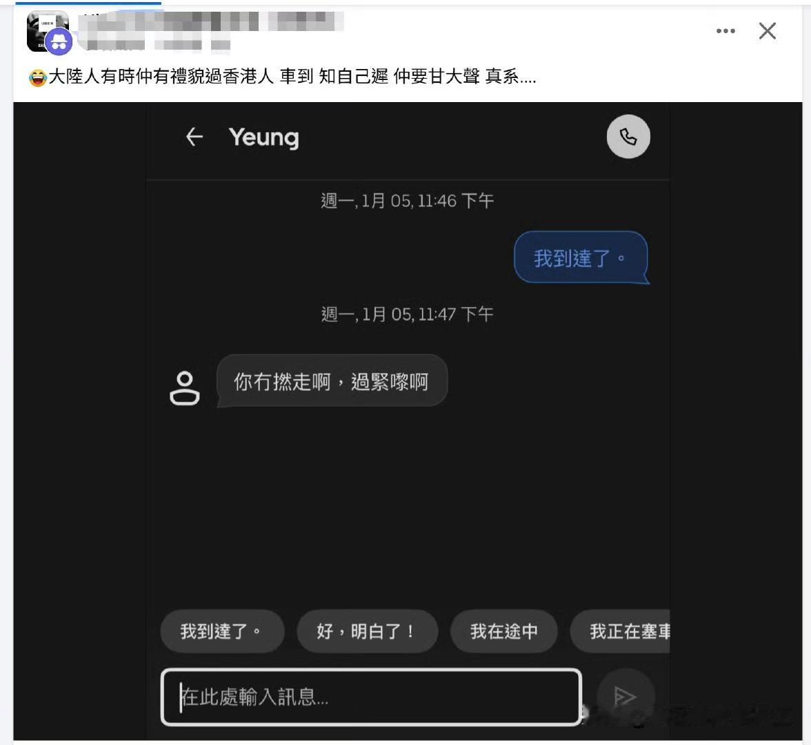 网友发帖, 有乘客叫网约车:到了。 香港网约车司机:你冇撚走。 司机如此说
