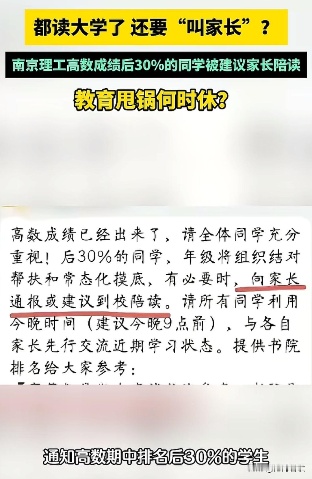 大学生也要陪读? 南京理工大学,你以这种方式让我刮目相看 高数成绩后30%的同学有福了 他们被建议要家长来学校陪读 这个陪读文化都是谁开的头? 学生到了学校就归学校管了 成绩有好有差也都是正常的 家长都不用工作了? 大学生也被要求叫家长陪读就更离谱了 家长自己高中数学能整明白的都不多 再去大学陪读高数? 估计上课都会睡着 一点效果都没有 南京高校大学生 高校学习陪读 江苏陪读
