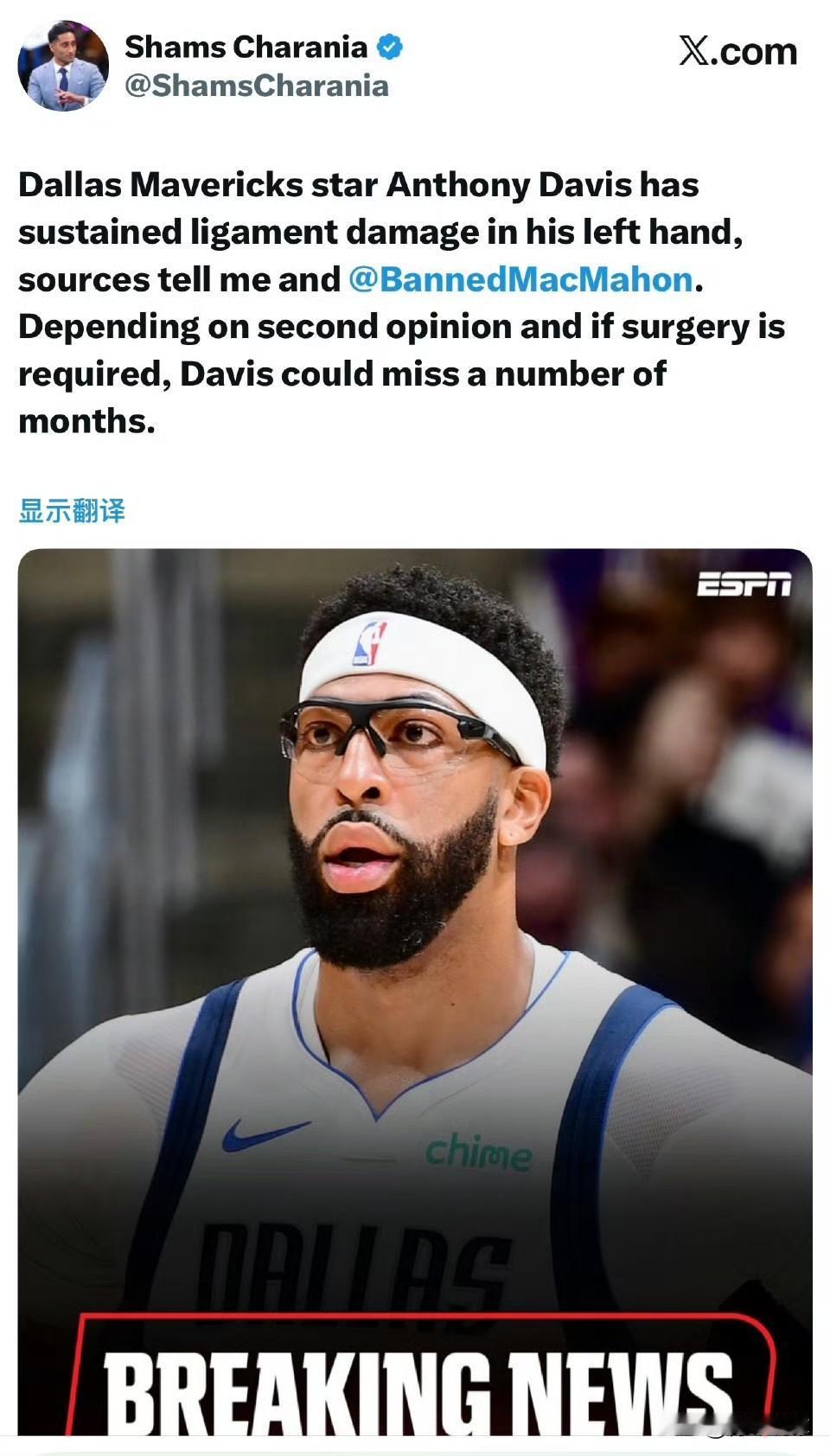 坏消息!下面是关于独行侠球星浓眉的最新伤情! 据权威记者Shams报道:独行侠队球星浓眉遭遇了左手韧带受伤,可能将缺席数月的比赛。如果需要手术治疗,他缺席时间会更长。 浓眉是在昨天对阵爵士队最后2分多钟遭遇了受伤,并因此退出了比赛。在2月6日交易截止日越来越近之际又伤停了,这对浓眉和他的经纪人团队来说可不是什么好事情。富保罗公司一直在推动有关浓眉的交易,但这次受伤是一个变数,会让很多球队望而却步。 如今浓眉及经纪人富保罗将面临两个选择,一是退出交易市场继续待在独行侠,等伤愈复出打出好的表现后在休赛期再行操作;二是继续推动交易,但要降低交易要求,尤其是在续约金额和年限上要作出让步。对于富保罗和浓眉来说,这份续约合同或将是后者职业生涯的最后一份大合同,他们肯定会积极争取,不会轻易让步的,那就只能先不做交易了,等后面再说。