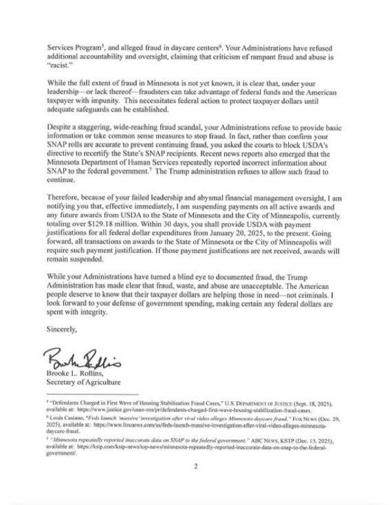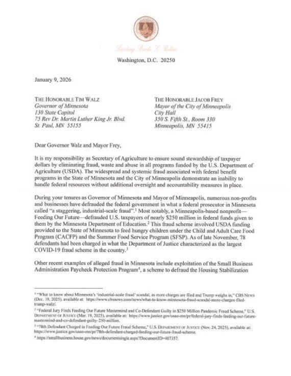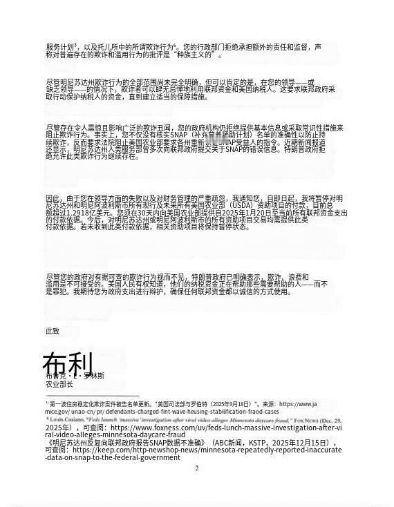 新闻快讯——美国农业部(USDA)暂停对明尼苏达州的所有联邦资金,即刻生效。