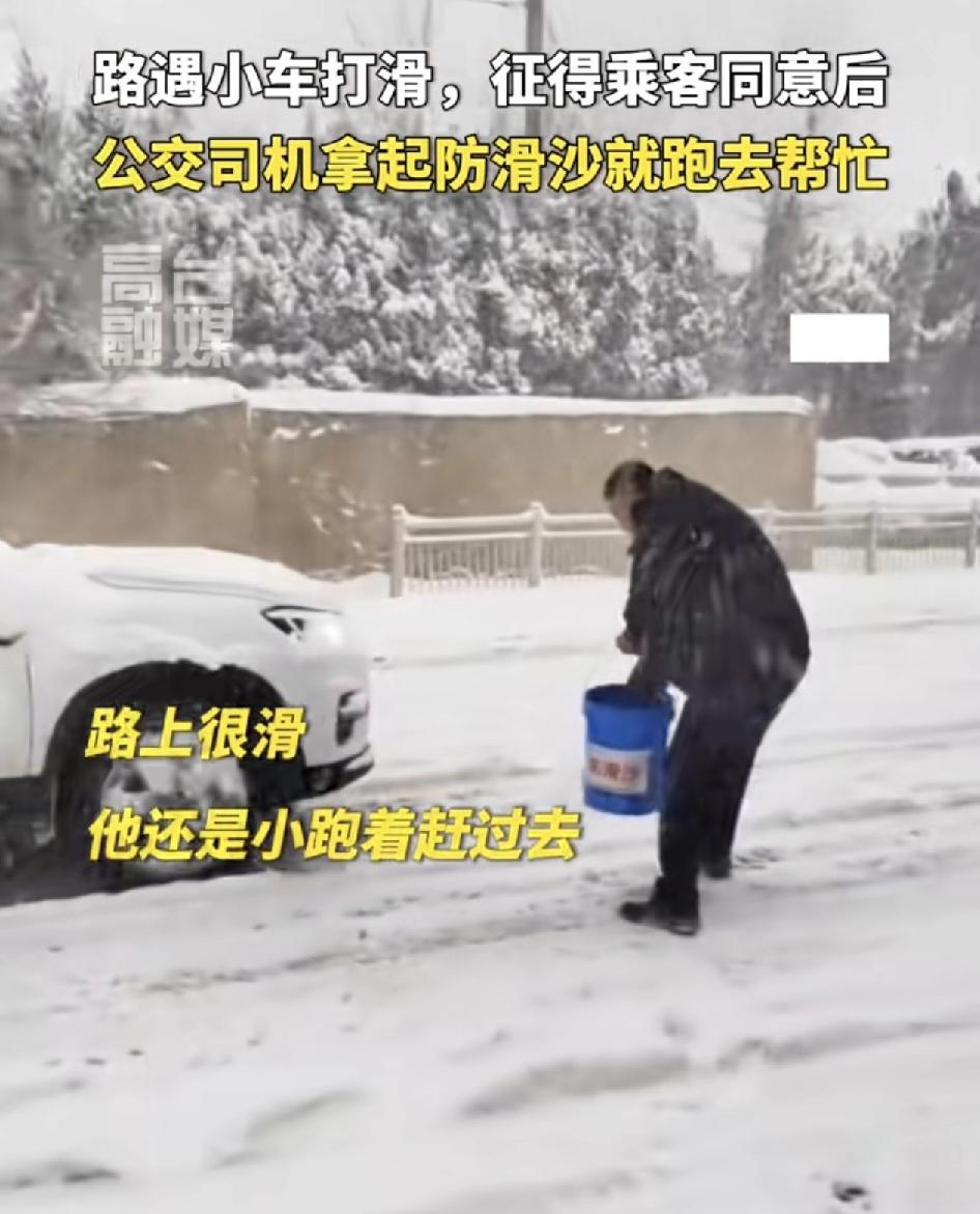 山东一名公交车司机在行车过程中,看见旁边的一辆小车打滑,在征得全车乘客的同意之后,他感。赶紧到旁边拿起沙子,帮忙在小车的轮车轮下撒沙子,沙子一撒立竿见影的效果就出来了。很多乘客对于司机的好心行为表示非常认同。在这种紧急情况下,能够遇到陌生人士的帮助确实是一种莫大的幸运。