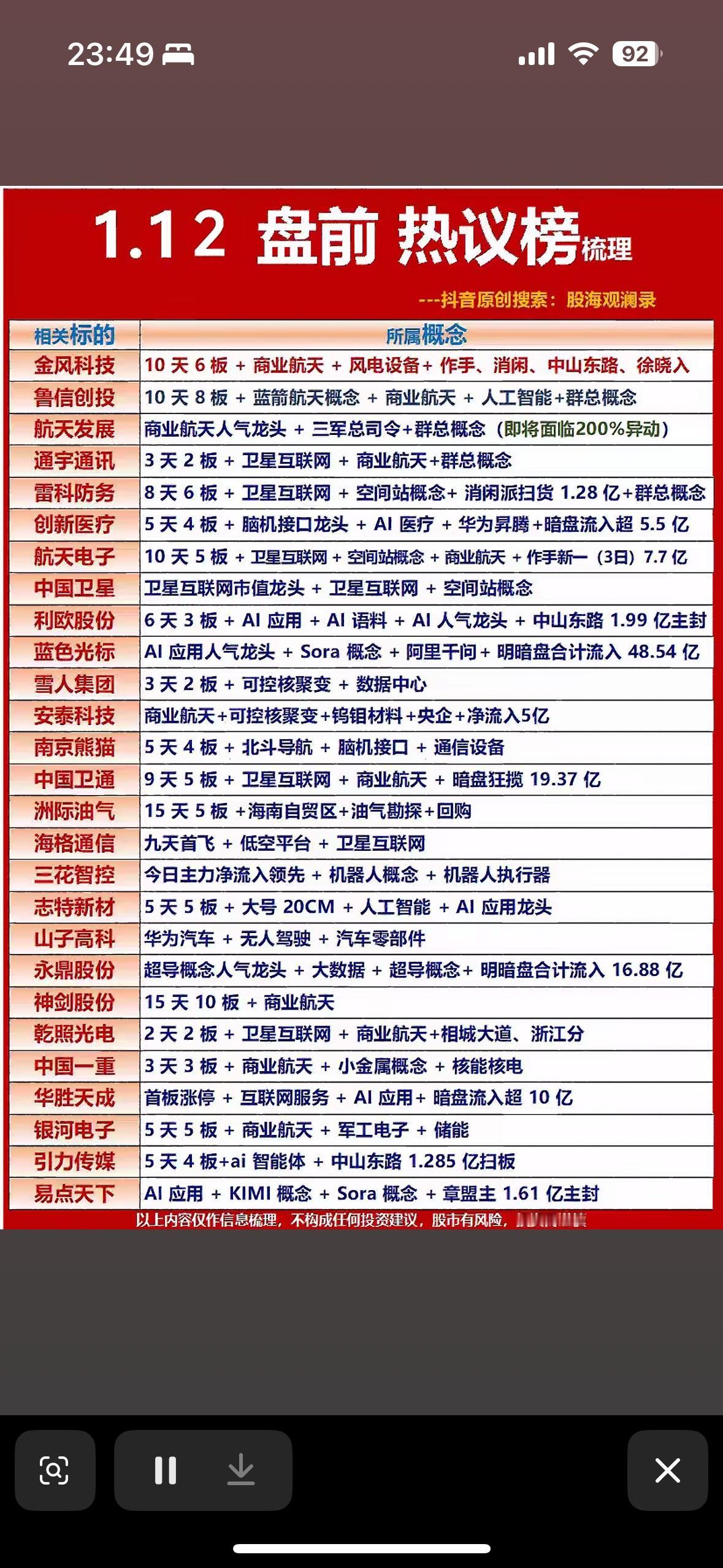 "1月12日盘前热点:商业航天、AI医疗、卫星互联网概念股活跃,多只个股连板,资金暗流涌动,投资需谨慎。"
