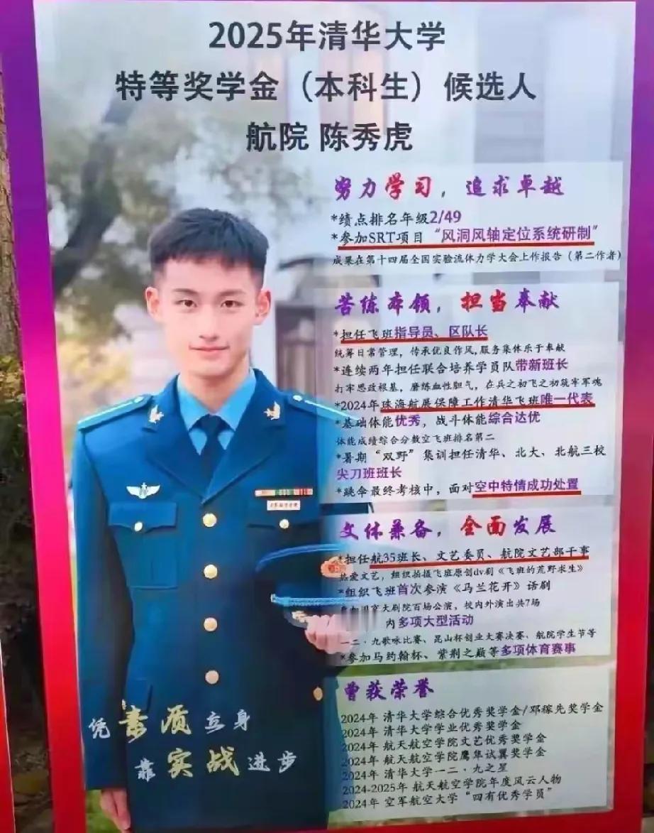 清华“飞班”陈秀虎,简直太牛啦!军事素质稳居前三,学业在飞行学员班排第二,会跳伞、能主持,科研也不在话下。 初中他就立志从军,高中在绵阳中学航空实验班获奖,2023年以招飞心品测试第一的成绩进入清华。 面对学业与军事训练双重压力,他自律又坚韧,体能从不及格到优秀。跳伞遇险他临危不惧,还多次主持校级活动、担任合唱指挥。2025年入围清华特奖答辩,刷屏网络。 陈秀虎用实力证明,新时代飞行学员既能翱翔天际,又能深耕学术、绽放人文光彩! 陈秀虎 陈秀才