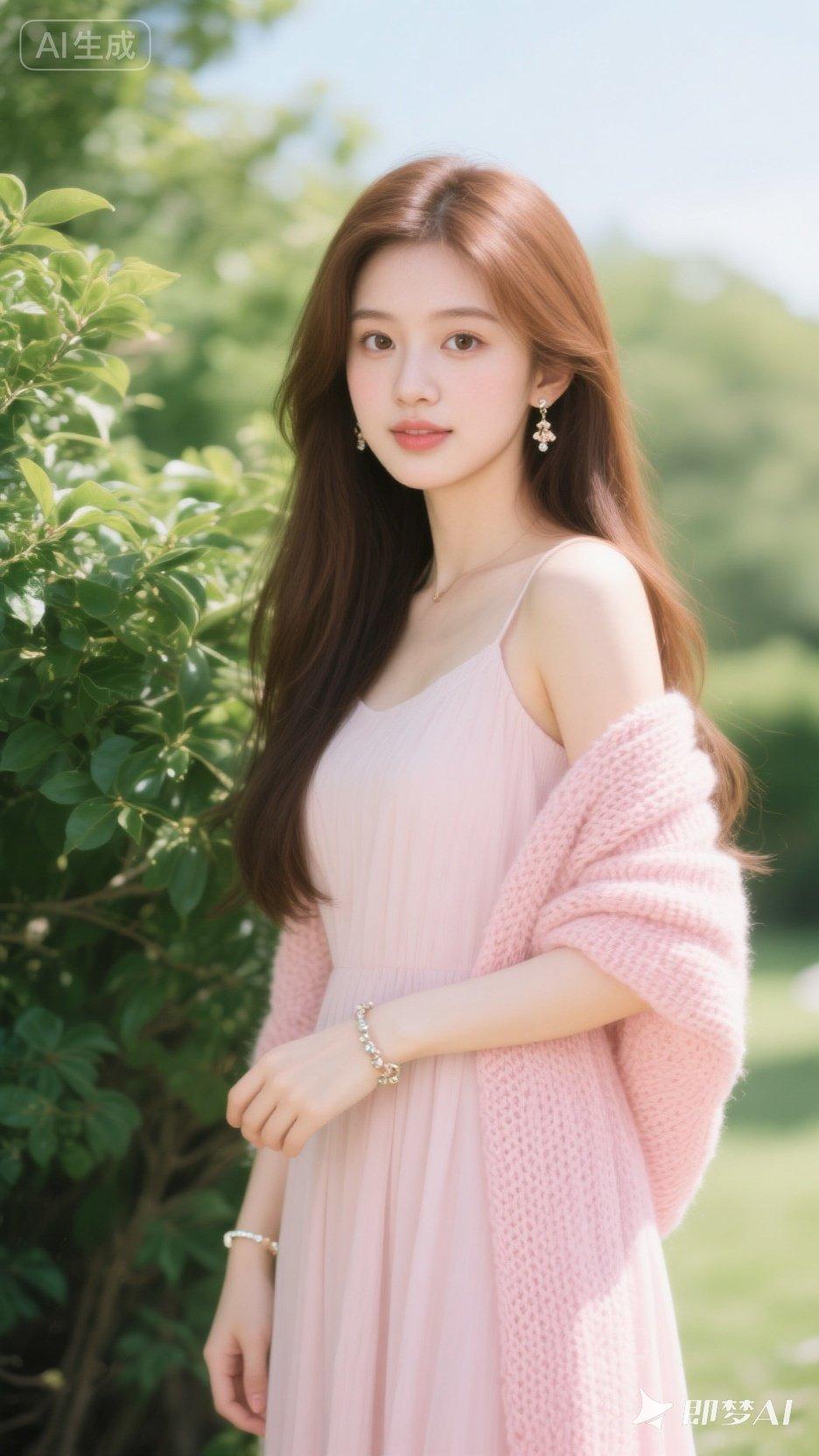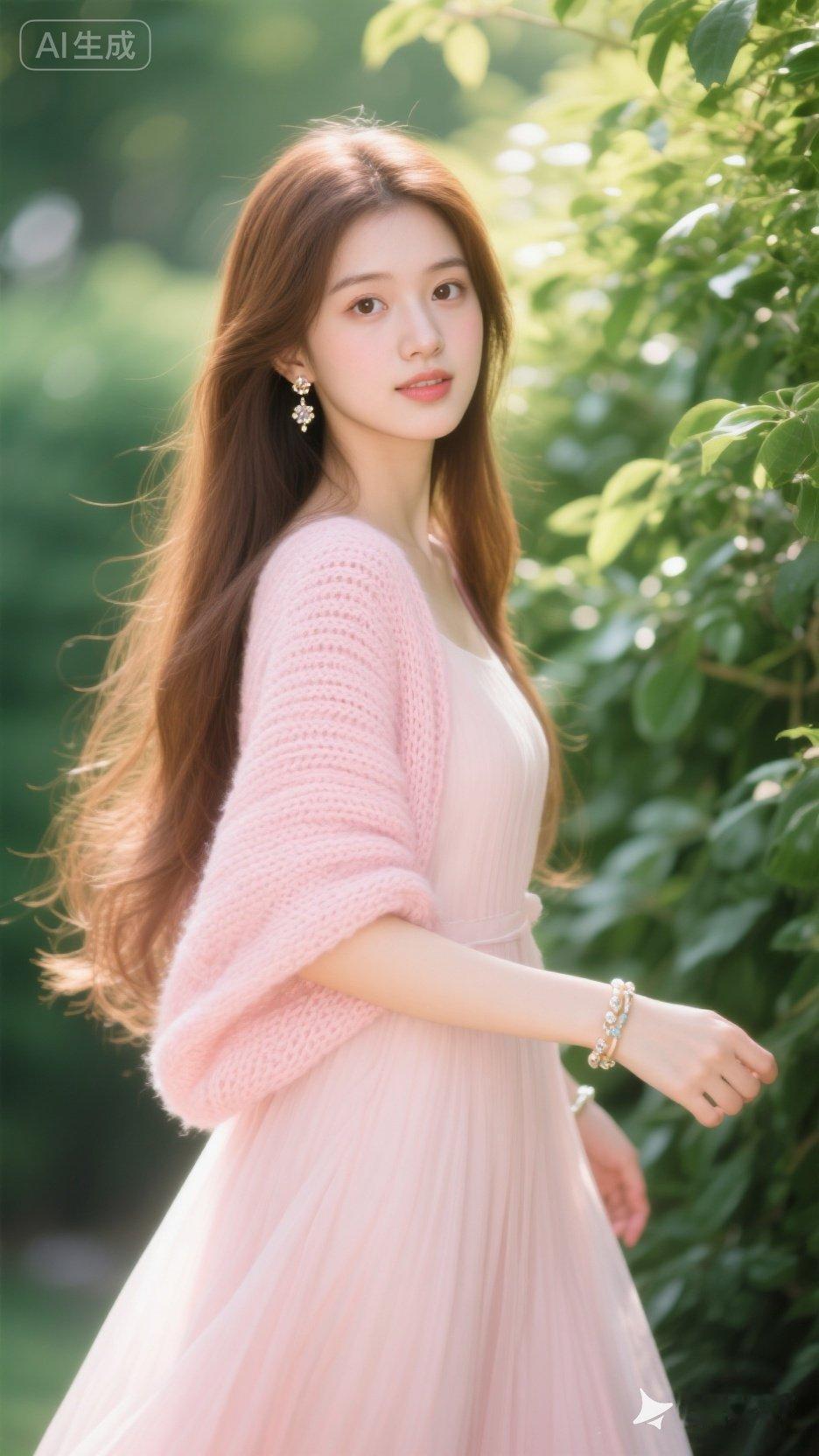 夏日田野里的少女,粉色连衣裙与自然相映成趣。
