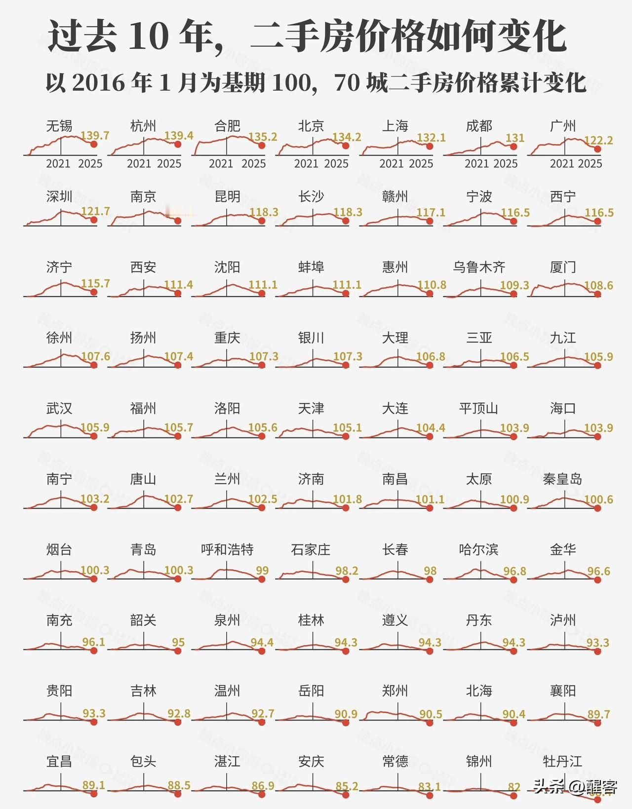过去10年各城市二手房价格变化情况,真正抗跌的只有第一排,那也同样回到了2016-2017年的水平了。 按照目前房地产市场的“推陈出新”策略,为了刺激更大更高标准的房地产产品需求,二手房产品的落后性与新产品形成鲜明对比,必然会加速二手房价格的下降和新房价格长期而缓慢的上涨。 这就像苹果手机,采用“挤牙膏”的方式每年升级一次性能和外观,让所谓有“改善需求”和投资需求的目标人群,或者像苹果手机一样,有的人就觉得必须每年换一个新款才显得自己符合潮流。