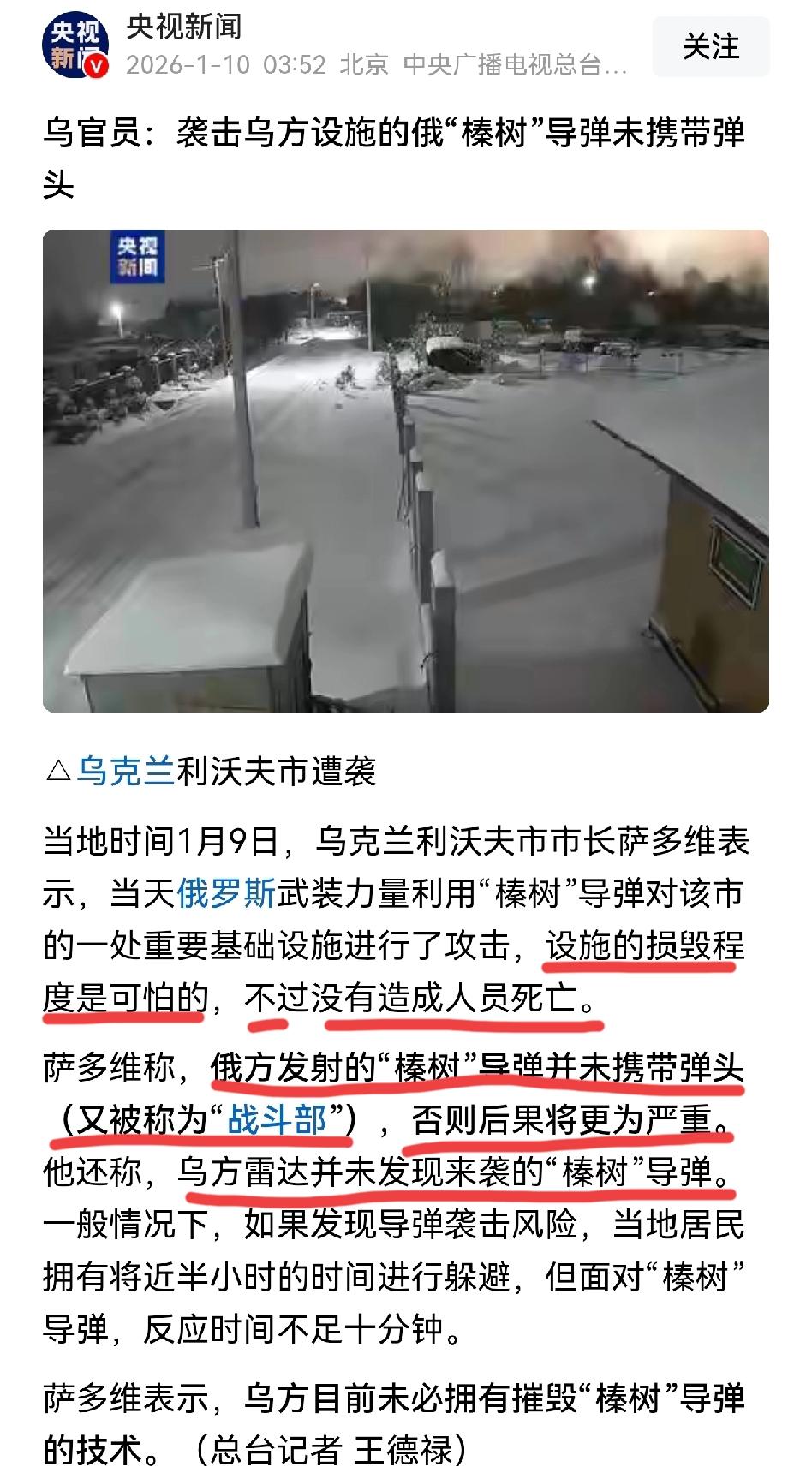 欧洲战争史上极其罕见、诡异的一幕,近日由俄、乌联袂呈现。 你用心险恶用无人机偷袭我总统官邸,我耿直厚道用无弹头高超音速导弹打击你基础设施。普京释放的强大威慑和极度克制,泽连斯基,你接收到了吗? 先说下几个关键词: 1、榛树导弹:“榛树”在俄罗斯语中,寓意神谕、引导与惩戒 2、高超音速:飞速十马赫,拦截难度大 3、远程打击利沃夫:乌克兰西部州府,与波兰接壤(该地波、乌双方历史上曾有拉扯),俄导弹飞跨乌克兰全境,精准命中上千公里之外重要民用设施 4、没有携带战斗部:意即空心弹头,俄方故意没装填高烈爆炸药,完全靠物理动能打击(被炸现场火光不大可以证明这点,见图3、4) 5、乌方反馈:重要基础设施损失大(无战斗部,仅靠动能,威力仍不小),但无人员伤亡,且雷达没有事前发现 综上,我认为普京想通过此次行动,向泽连斯基及其欧美盟友传递以下几点信号: 1、谁敢打我,我必须打谁 2、我有足够的能力打疼你,只是现在不想下狠手而已 3、顺道警告波兰,别瞎掺和,否则,连你一起收拾 4、劝司机知难而退,知错即改,否则,下次就搞个实弹打击,而且可以是基辅,甚至是司机官邸。 看效果,目前司机应该是吓懵了,也读懂了,暂时没吱声。波兰好像也消停了下。 希望大帝的隐忍与苦心不白费,希望俄乌冲突早日结束。因为受伤害最深的,永远是老百姓。 世界和平安宁,多好!