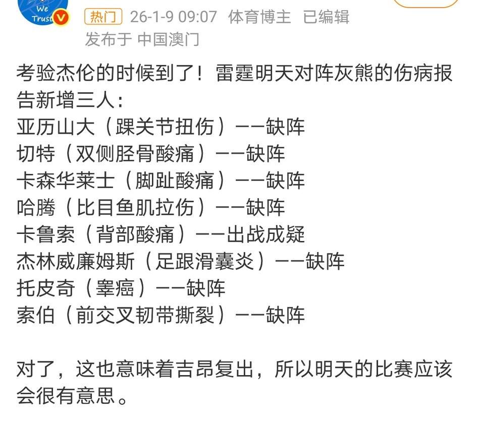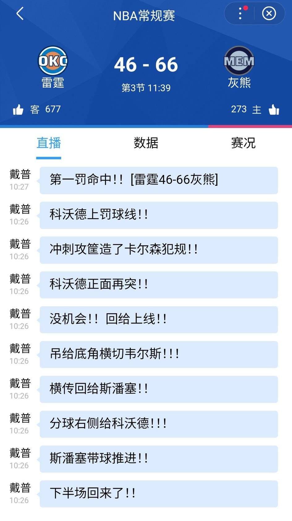 没想到今天的雷霆依然很抽象,雷霆仿佛一夜之间跌下神坛……今天打灰熊,半场结束,雷霆46-65落后灰熊。 缺乏主力的雷霆今天被灰熊追着打。雷霆队近期完全不在状态,接二连三的输球。卫冕冠军自从连续输给马刺,感觉就好像被很多球队找到突破口一样。 看来今天输球不可避免了……