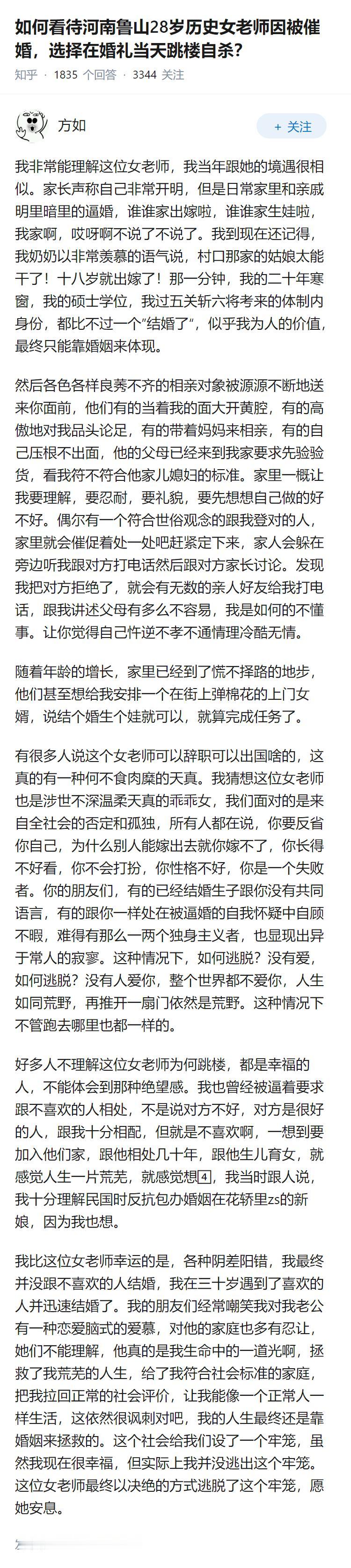 如何看待河南鲁山28岁历史女老师因被催婚,选择在婚礼当天跳楼自杀?