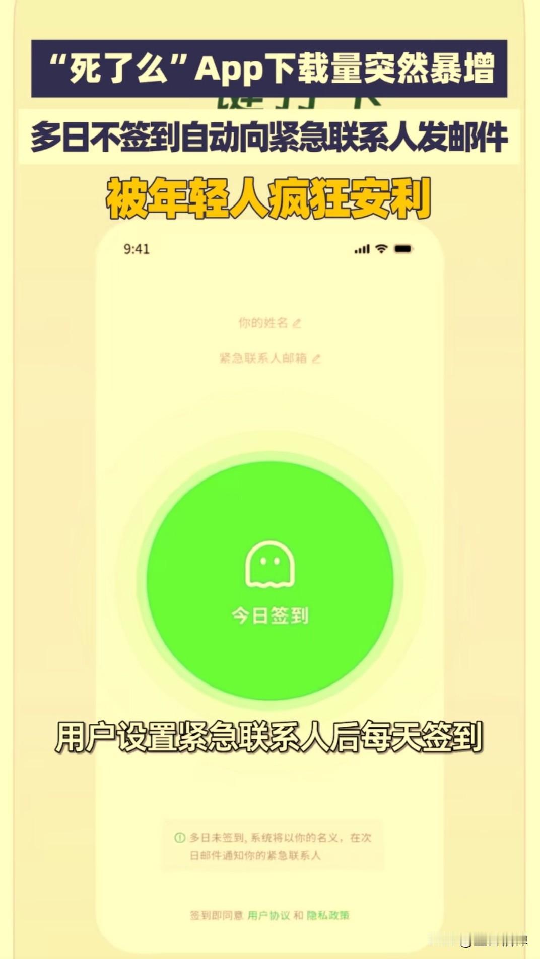 一款专为单身独居人士打造的APP“死了么”上线了,一上线在年轻人这里广受欢迎,该APP目前在付费下载榜单里面排名第五位。 该APP售价8元,目前只在苹果商店上线,安卓还没有。用户使用需要设置紧急联系人,然后每天坚持打卡,如果连续几天没有打卡,会给紧急联系人发送邮件通知。 网友说:我妈说我不找对象以后一人死屋里都不知道” 这回破解了。也有网友表示这个名字不好听,应该改成“活着么”好听一点。 还有打卡很容易忘记,我这种不爱签到的,隔三差五就得死,还不如改成解锁手机了就默认签到,这样一举两得。 大家怎么看呢? 来源:大象新闻
