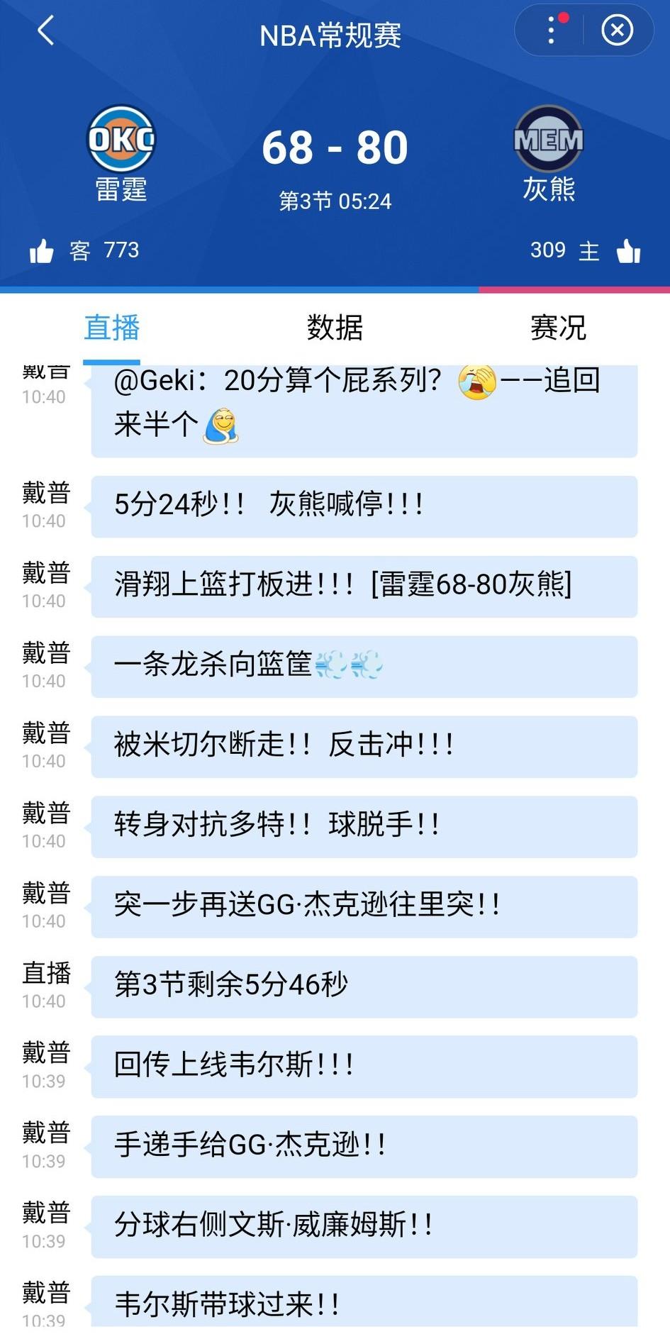 这就是冠军底蕴!雷霆落后灰熊20多分,追到只差10几分。 雷霆以81-94落后灰熊进入最后一节,只能说不是没希望,第三节的篮板甚至抢赢了对手。 第四节还有10分钟,雷霆85-96灰熊。